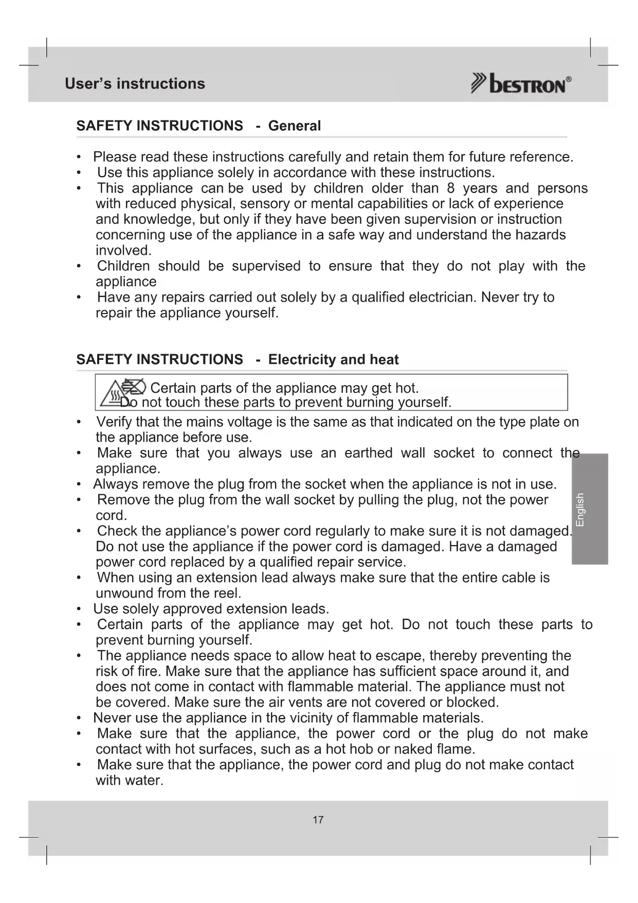 SAFETY INSTRUCTIONS - Electricity and heat