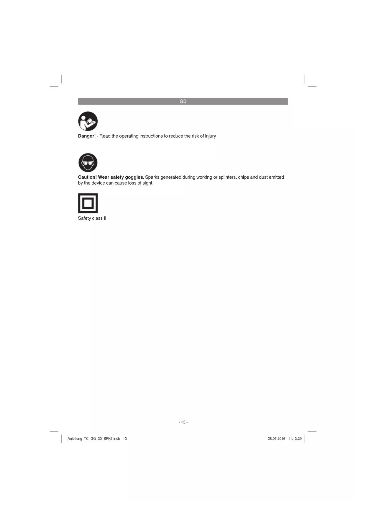 Danger! - Read the operating instructions to reduce the risk of injury Caution! Wear safety goggles. Sparks generated during working or splinters, chips and dust emitted by the device can cause loss of sight. Safety class II Anleitung_TC_GG_30_SPK1.indb 13Anleitung_TC_GG_30_SPK1.indb 13 28.07.2016 11:13:2928.07.2016 11:13:29GB