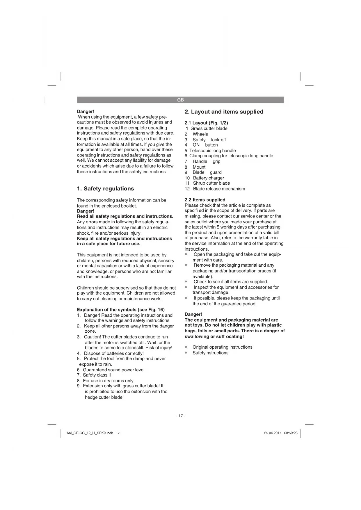 The unit is supplied in packaging to prevent its being damaged in transit. This packaging is raw material and can therefore be reused or can be returned to the raw material system. The unit and its accessories are made of various types of material, such as metal and plastic. De- fective components must be disposed of as spe- cial waste. Ask your dealer or your local council. Anl_GE-CG_12_Li_SPK9.indb 20Anl_GE-CG_12_Li_SPK9.indb 20 25.04.2017 08:59:2325.04.2017 08:59:23GB