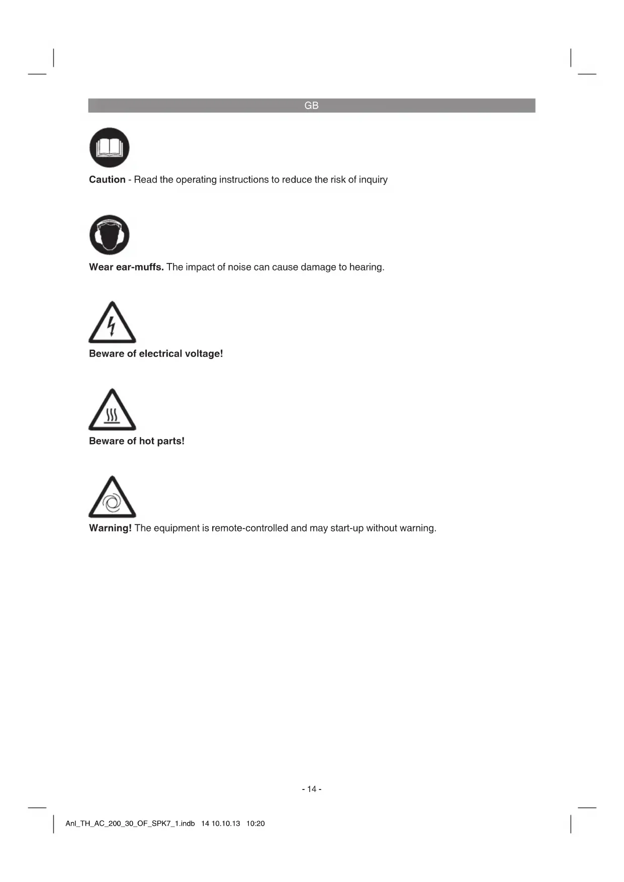 Beware of electrical voltage! Beware of hot parts! Warning! The equipment is remote-controlled and may start-up without warning. Wear ear-mus. The impact of noise can cause damage to hearing. Caution - Read the operating instructions to reduce the risk of inquiry