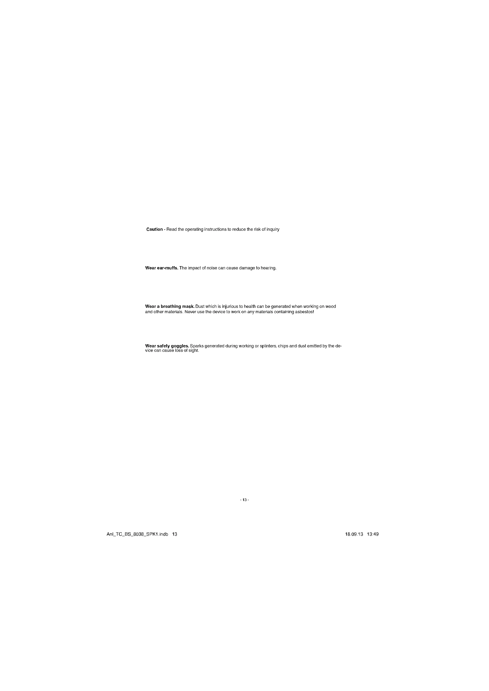 Caution - Read the operating instructions to reduce the risk of inquiry Wear ear-muff s. The impact of noise can cause damage to hearing. Wear safety goggles. Sparks generated during working or splinters, chips and dust emitted by the de- vice can cause loss of sight. Wear a breathing mask. Dust which is injurious to health can be generated when working on wood and other materials. Never use the device to work on any materials containing asbestos! Anl_TC_BS_8038_SPK1.indb 13Anl_TC_BS_8038_SPK1.indb 13 18.09.13 13:4918.09.13 13:49GB
