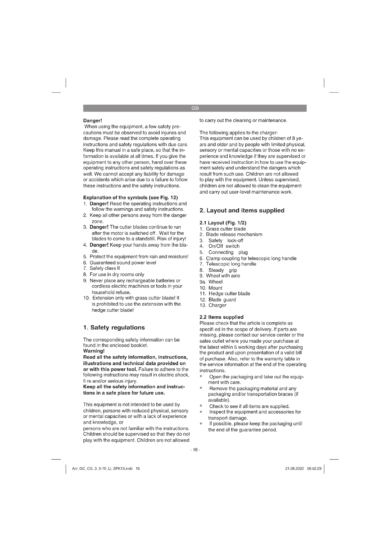 Check the cable connection from the unit to the telescopic long handle. If the equipment will not work in spite of the volta- ge supply being OK, please send it to the custo- mer service address. Anl_GC_CG_3_6-70_Li_SPK13.indb 20Anl_GC_CG_3_6-70_Li_SPK13.indb 20 21.06.2022 08:52:3121.06.2022 08:52:31GB