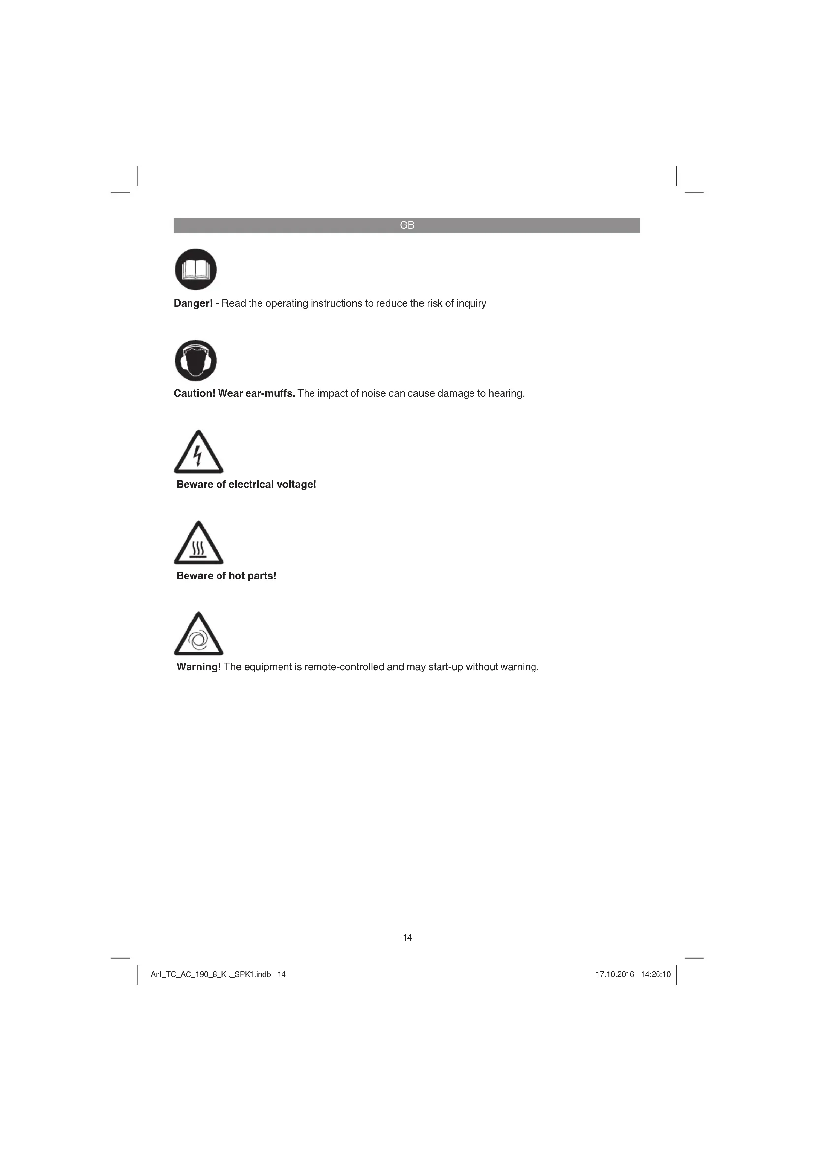 Beware of electrical voltage! Beware of hot parts! Warning! The equipment is remote-controlled and may start-up without warning. Caution! Wear ear-muff s. The impact of noise can cause damage to hearing. Danger! - Read the operating instructions to reduce the risk of inquiry Anl_TC_AC_190_8_Kit_SPK1.indb 14Anl_TC_AC_190_8_Kit_SPK1.indb 14 17.10.2016 14:26:1017.10.2016 14:26:10GB