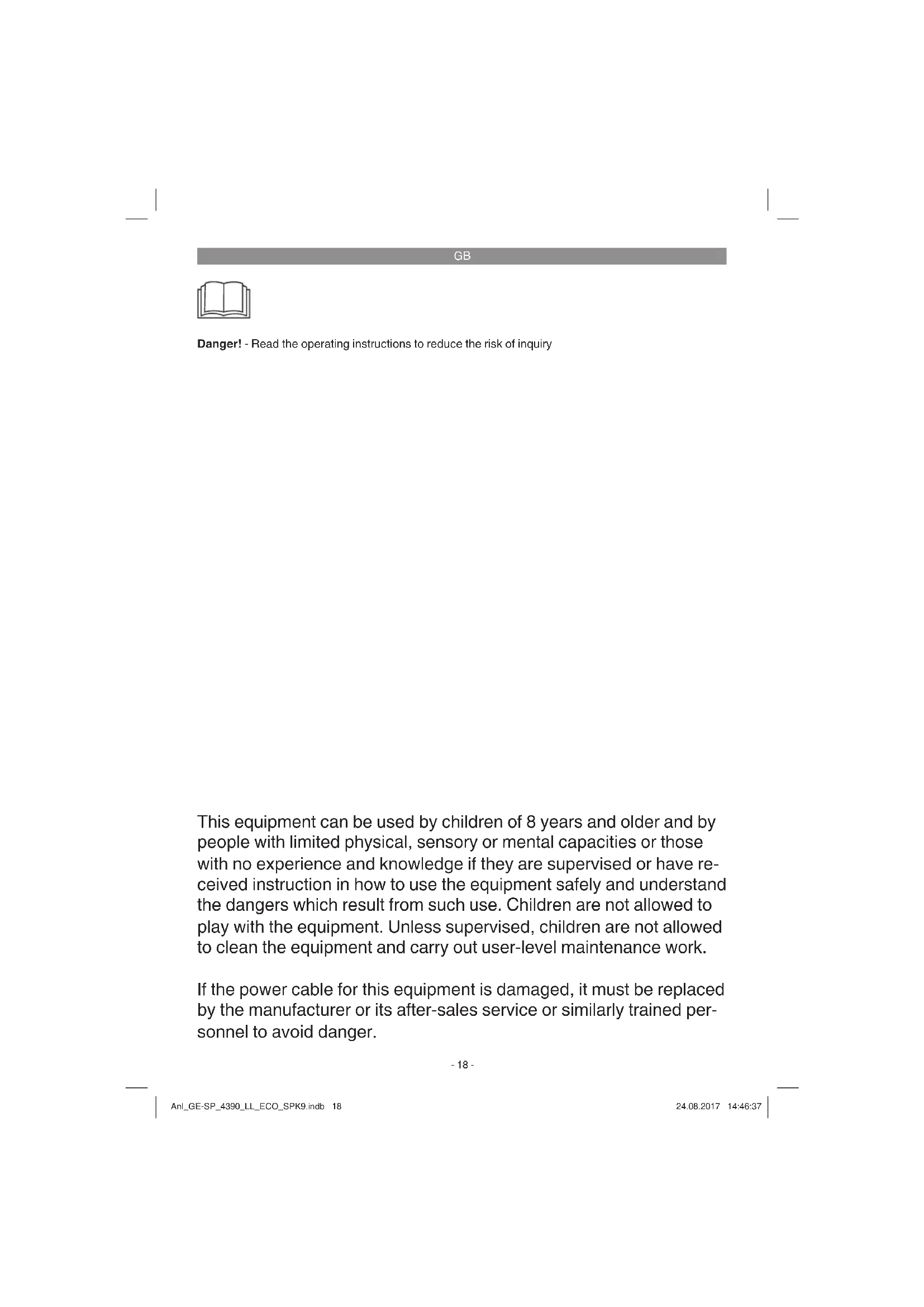 This equipment can be used by children of 8 years and older and by people with limited physical, sensory or mental capacities or those with no experience and knowledge if they are supervised or have re- ceived instruction in how to use the equipment safely and understand the dangers which result from such use. Children are not allowed to play with the equipment. Unless supervised, children are not allowed to clean the equipment and carry out user-level maintenance work. If the power cable for this equipment is damaged, it must be replaced by the manufacturer or its after-sales service or similarly trained per- sonnel to avoid danger. Danger! - Read the operating instructions to reduce the risk of inquiry Anl_GE-SP_4390_LL_ECO_SPK9.indb 18Anl_GE-SP_4390_LL_ECO_SPK9.indb 18 24.08.2017 14:46:3724.08.2017 14:46:37GB
