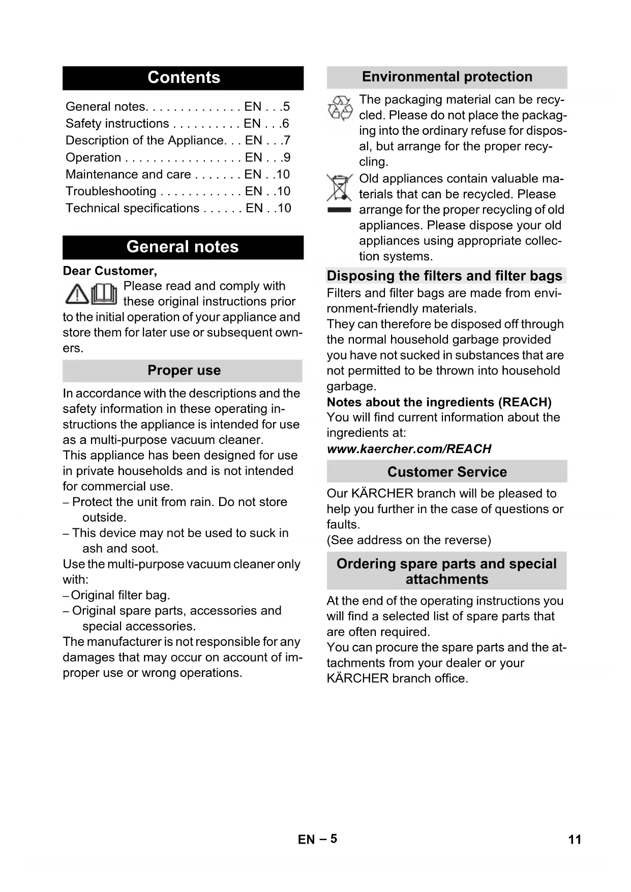 - Leistung P nenn 1000 W Netzabsicherung (träge) 10 A Behältervolumen 20 l Wasseraufnahme mit Handgriff 12 l Wasseraufnahme mit Bo- dendüse 10 l Netzkabel H05VV-F 2x0,75 Schalldruckpegel (EN 60704-2-1) 72 dB(A) Gewicht (ohne Zubehör) MV 4 7,0 kg Gewicht (ohne Zubehör) MV 4 Premium 7,3 kg 10 DE– 5 Dear Customer, Please read and comply with these original instructions prior to the initial operation of your appliance and store them for later use or subsequent own- ers. In accordance with the descriptions and the safety information in these operating in- structions the appliance is intended for use as a multi-purpose vacuum cleaner. This appliance has been designed for use in private households and is not intended for commercial use. – Protect the unit from rain. Do not store outside. – This device may not be used to suck in ash and soot. Use the multi-purpose vacuum cleaner only with: – Original filter bag. – Original spare parts, accessories and special accessories. The manufacturer is not responsible for any damages that may occur on account of im- proper use or wrong operations. The packaging material can be recy- cled. Please do not place the packag- ing into the ordinary refuse for dispos- al, but arrange for the proper recy- cling. Old appliances contain valuable ma- terials that can be recycled. Please arrange for the proper recycling of old appliances. Please dispose your old appliances using appropriate collec- tion systems. Filters and filter bags are made from envi- ronment-friendly materials. They can therefore be disposed off through the normal household garbage provided you have not sucked in substances that are not permitted to be thrown into household garbage. Notes about the ingredients (REACH) You will find current information about the ingredients at: www.kaercher.com/REACH Our KÄRCHER branch will be pleased to help you further in the case of questions or faults. (See address on the reverse) At the end of the operating instructions you will find a selected list of spare parts that are often required. You can procure the spare parts and the at- tachments from your dealer or your KÄRCHER branch office. Contents General notes