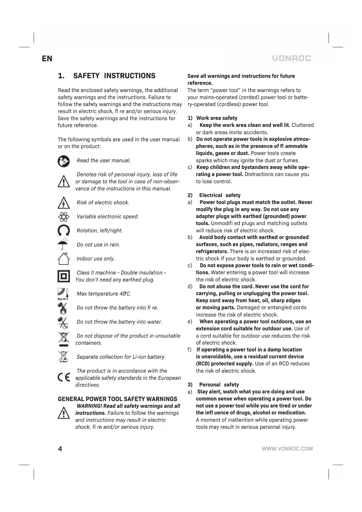 ENVIRONMENT Faulty and/or discarded electrical or electronic apparatus have to be collected at the appropriate recycling locations. Only for EC countries Do not dispose of power tools into domestic waste. According to the European Guideline 2012/19/ EC for Waste Electrical and Electronic Equipment and its implementation into national right, power tools that are no longer usable must be collected separately and disposed of in an environmentally friendly way. WARRANTY VONROC products are developed to the highest quality standards and are guaranteed free of defects in both materials and workmanship for the period lawfully stipulated starting from the date of original purchase. Should the product develop any failure during this period due to defective material and/or workmanship then contact VONROC directly. The following circumstances are excluded from this guarantee: