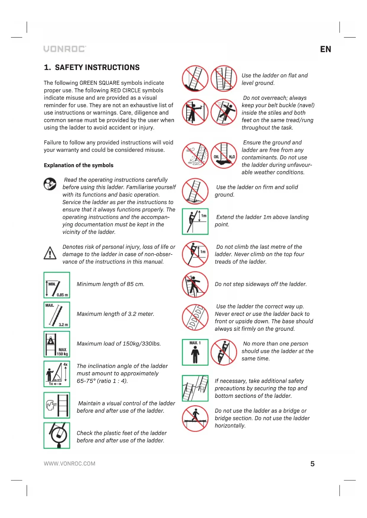 Fully collapse the ladder, closing all rungs, and secure before storage or handling. Cleaning Regularly clean the machine, preferably after each use. Clean with a suitable proprietary household cleaner and a soft dry cloth. Do not submerge your ladder in water or any liquid for any reason.Do not use solvents (petrol, alcohol, ammonia, etc.) as they will damage the plastic parts. Storage Store your ladder indoors in a dry environment away from contaminants. Do not rest other objects on the ladder. Only store the ladder when it is dry. Do not subject your ladder system to humid or damp environments, these can damage the ladder.Store the correct way up. The base should always sit on the ground.Store out of reach of children. Maintenance Never use a damaged or broken telescopic ladder. Temporary repairs are not permitted. Check the plastic feet of the ladder before and after use of the ladder. Do not use the ladder without the plastic feet or when the plastic feet are worn. The ladder is fitted with plastic covers at the top of the ladder, preventing dust and other contaminants from en- tering the ladder. Do not use the ladder without the plastic covers. Always maintain a visual control of the ladder before and after use of the ladder. Repairs and maintenance shall be carried out by a competent person with suitable replacement parts. Unapproved third party spares are not recom- mended and will void your warranty. WARRANTY VONROC products are developed to the highest quality standards and are guaranteed free of defects in both materials and workmanship for the period lawfully stipulated starting from the date of original purchase. Should the product develop any failure du- ring this period due to defective material and/or work- manship then contact VONROC directly. The following circumstances are excluded from this guarantee:
