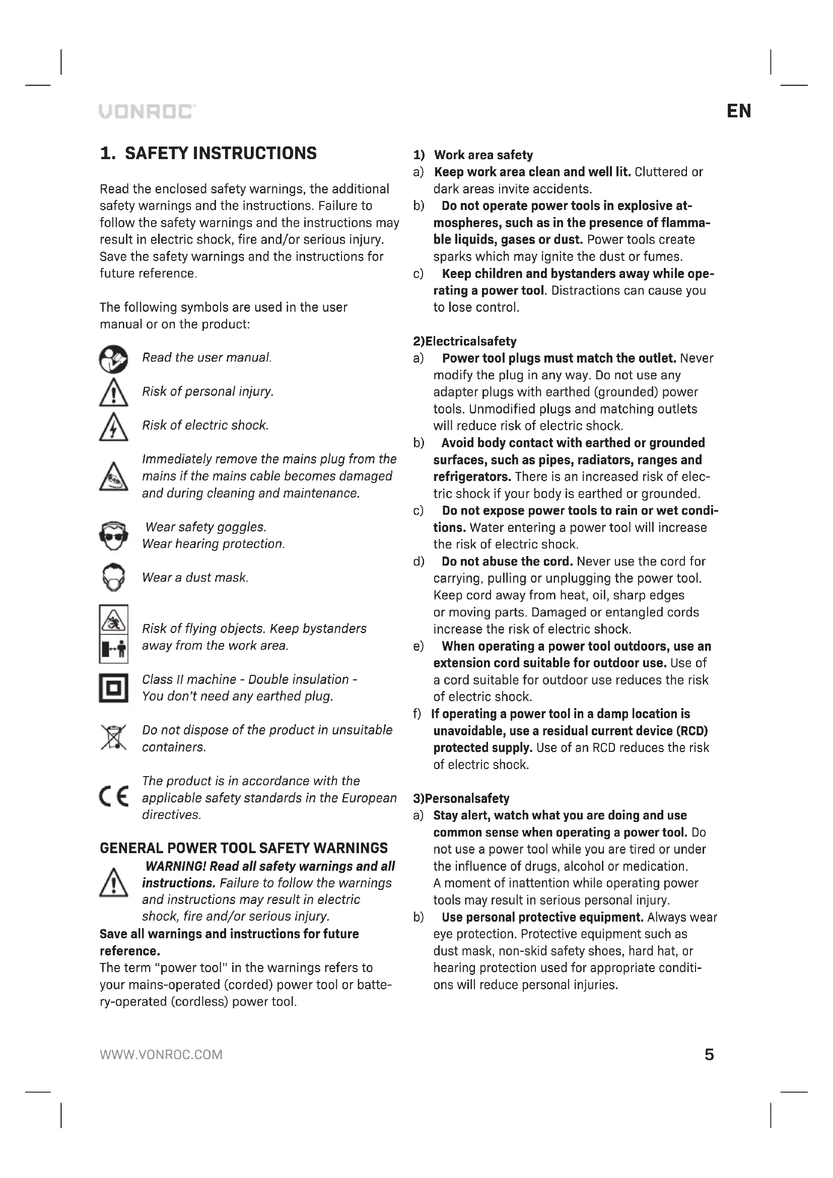 VONROC products are developed to the highest quality standards and are guaranteed free of defects in both materials and workmanship for the period lawfully stipulated starting from the date of original purchase. Should the product develop any failure during this period due to defective material and/or workmanship then contact VONROC directly.