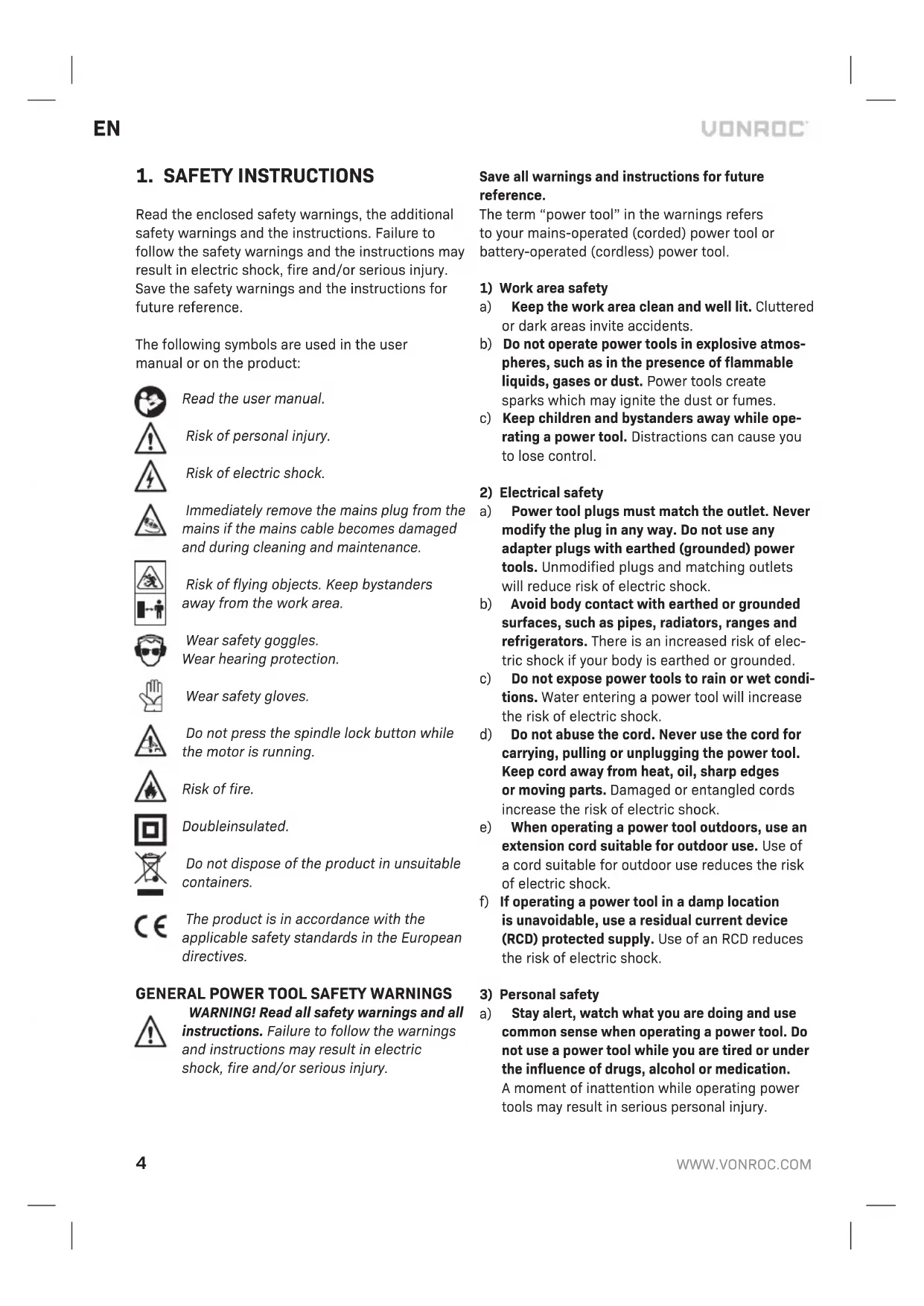 Always disconnect the machine from the main power supply before carrying out any maintenance work. Clean the machine casings regularly with a soft cloth, preferably after each use. Make sure that the ventilation openings are free of dust and dirt. Re- move very persistent dirt using a soft cloth moiste- ned with soapsuds. Do not use any solvents such as gasoline, alcohol, ammonia, etc. Chemicals such as these will damage the synthetic components. Only use sharp and undamaged grinding discs. ENVIRONMENT Faulty and/or discarded electrical or electronic apparatus have to be collected at the appropriate recycling locations. Only for EC countries Do not dispose of power tools into domestic waste. According to the European Guideline 2012/19/EC for Waste Electrical and Electronic Equipment and its implementation into national right, power tools that are no longer usable must be collected separately and disposed of in an environmentally friendly way. WARRANTY VONROC products are developed to the highest quality standards and are guaranteed free of defects in both materials and workmanship for the period lawfully stipulated starting from the date of original purchase. Should the product develop any failure during this period due to defective material and/or workmanship then contact VONROC directly. The following circumstances are excluded from this guarantee: