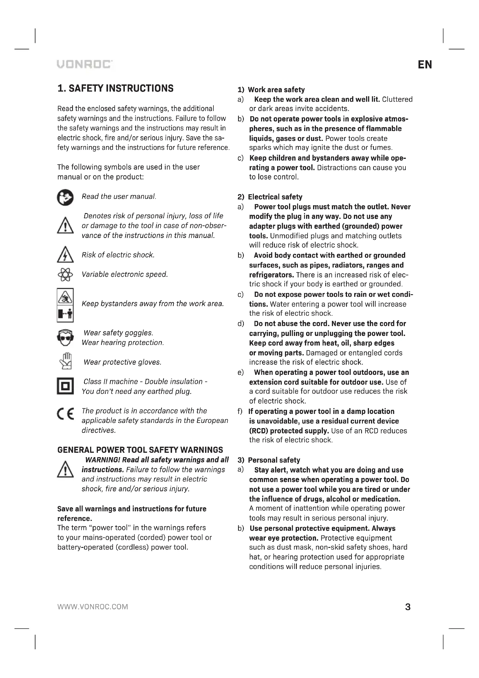 Read the enclosed safety warnings, the additional safety warnings and the instructions. Failure to follow the safety warnings and the instructions may result in electric shock, fire and/or serious injury. Save the sa- fety warnings and the instructions for future reference. The following symbols are used in the user manual or on the product: Read the user manual. Denotes risk of personal injury, loss of life or damage to the tool in case of non-obser- vance of the instructions in this manual. Risk of electric shock. Variable electronic speed. Keep bystanders away from the work area. Wear safety goggles. Wear hearing protection. Wear protective gloves. Class II machine - Double insulation - You don’t need any earthed plug. The product is in accordance with the applicable safety standards in the European directives.