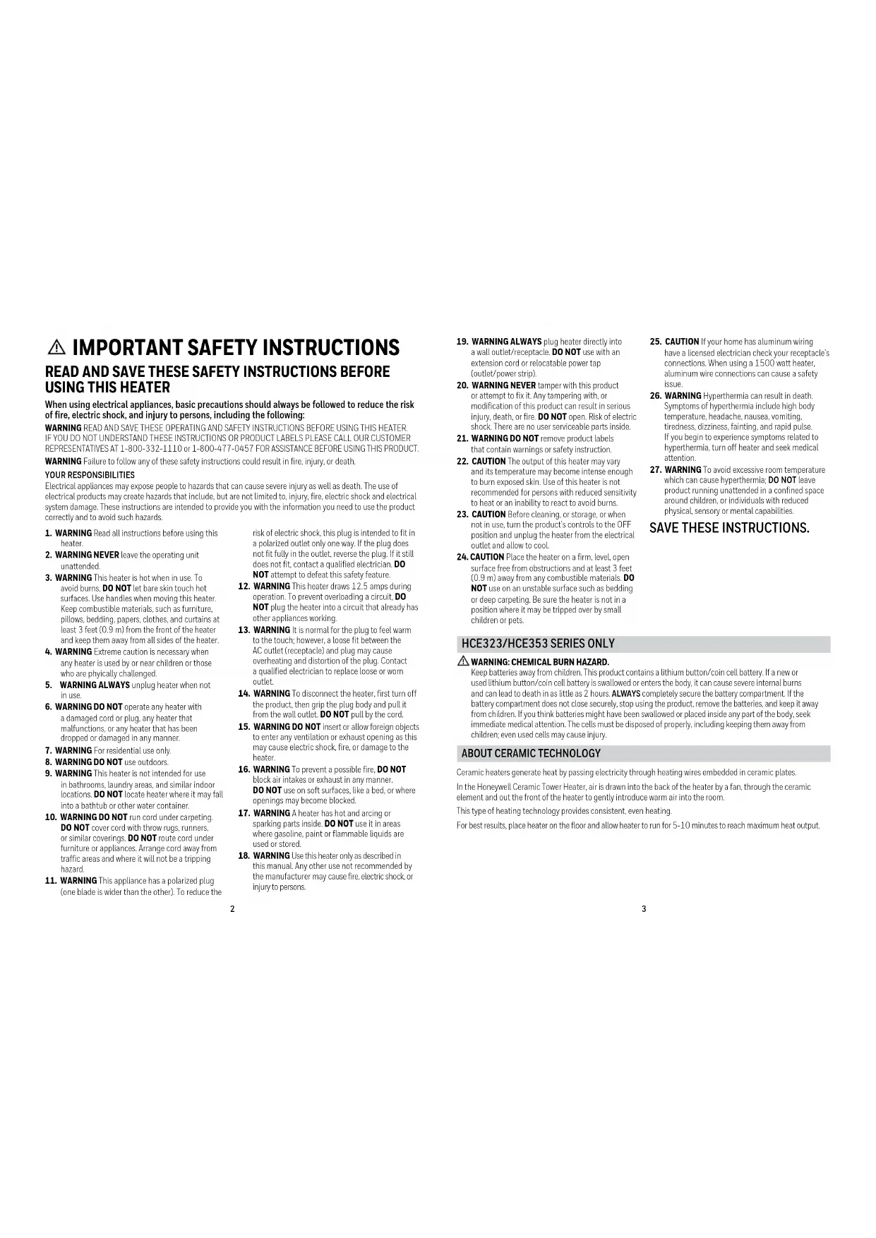 Owner’s Manual HCE300 Series Learn more about our safety features, scan with phone camera. Questions? Contact us Call: 1-800-332-1110 or 1-800-477-0457 in US: www.HoneywellPluggedIn.com/contact-us In Canada: www.HoneywellPluggedIn.ca2 3 1. WARNING Read all instructions before using this heater.2. WARNING NEVER leave the operating unit unattended.3. WARNING This heater is hot when in use. To avoid burns, DO NOT let bare skin touch hot surfaces. Use handles when moving this heater. Keep combustible materials, such as furniture, pillows, bedding, papers, clothes, and curtains at least 3 feet (0.9 m) from the front of the heater and keep them away from all sides of the heater.4. WARNING Extreme caution is necessary when any heater is used by or near children or those who are phyically challenged.