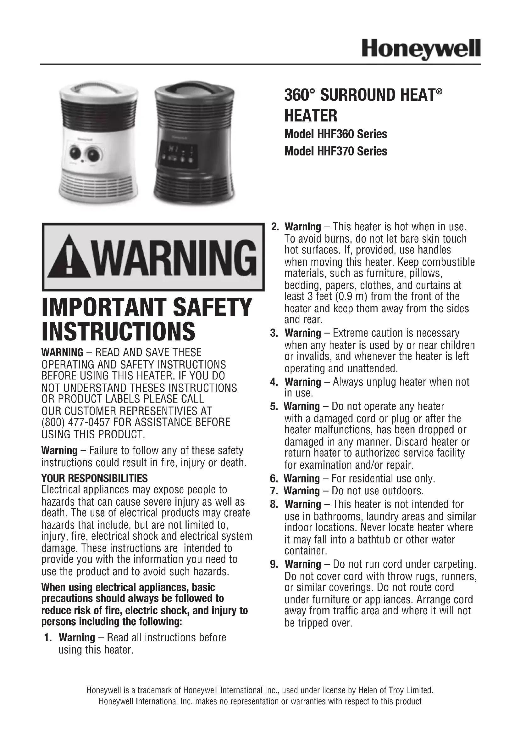 HEATER Model HHF360 Series Model HHF370 Series Honeywell is a trademark of Honeywell International Inc., used under license by Helen of Troy Limited. Honeywell International Inc. makes no representation or warranties with respect to this product IMPORTANT SAFETY INSTRUCTIONS