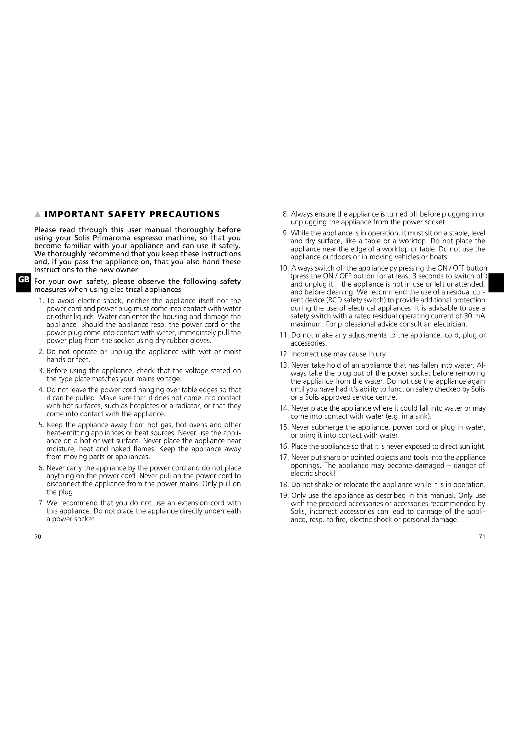 Please read through this user manual thoroughly before using your Solis Primaroma espresso machine, so that you become familiar with your appliance and can use it safely. We thoroughly recommend that you keep these instructions and, if you pass the appliance on, that you also hand these instructions to the new owner. For your own safety, please observe the following safety measures when using elec trical appliances:
