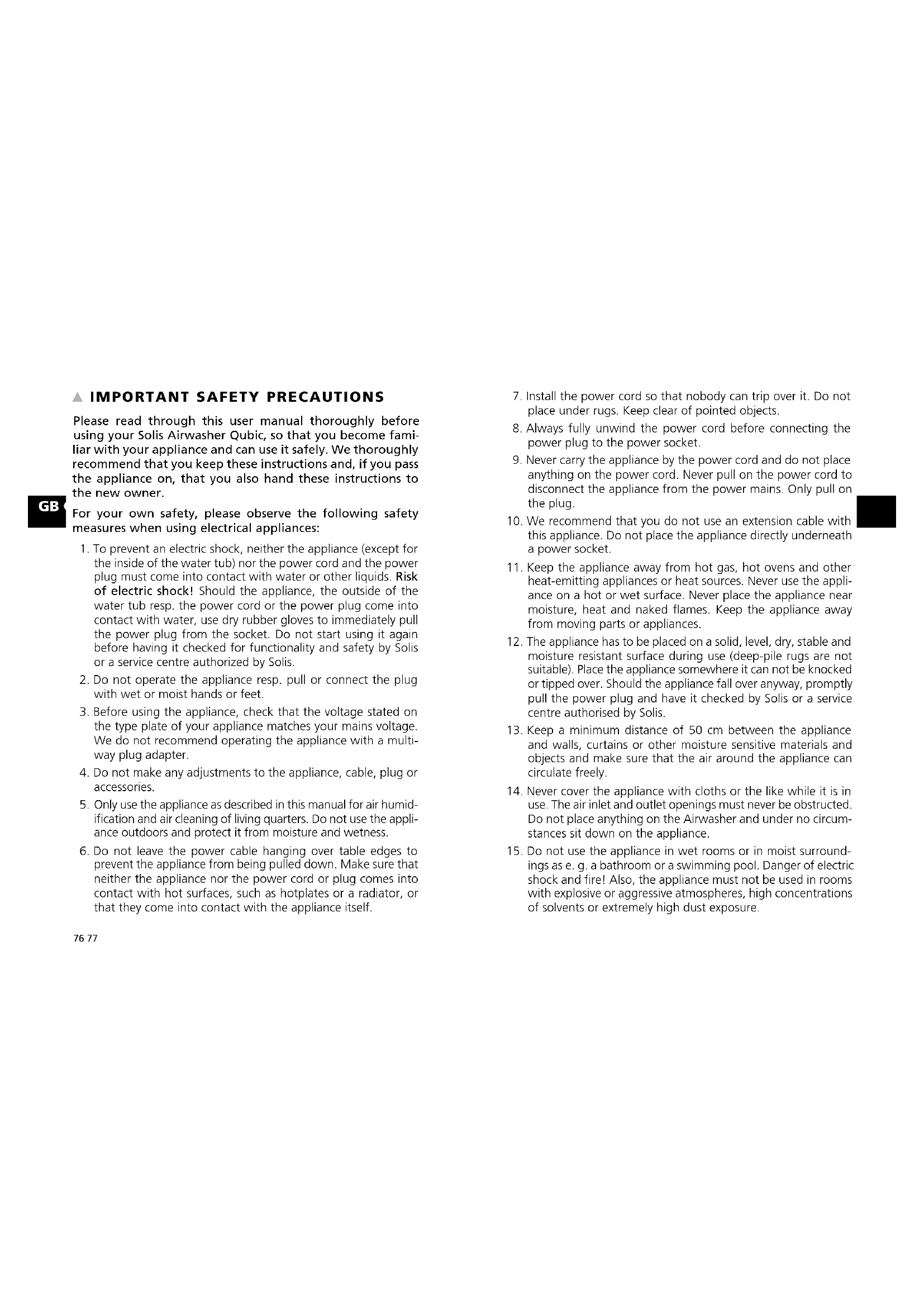 Please read through this user manual thoroughly before using your Solis Airwasher Qubic, so that you become fami- liar with your appliance and can use it safely. We thoroughly recommend that you keep these instructions and, if you pass the appliance on, that you also hand these instructions to the new owner. For your own safety, please observe the following safety measures when using electrical appliances: