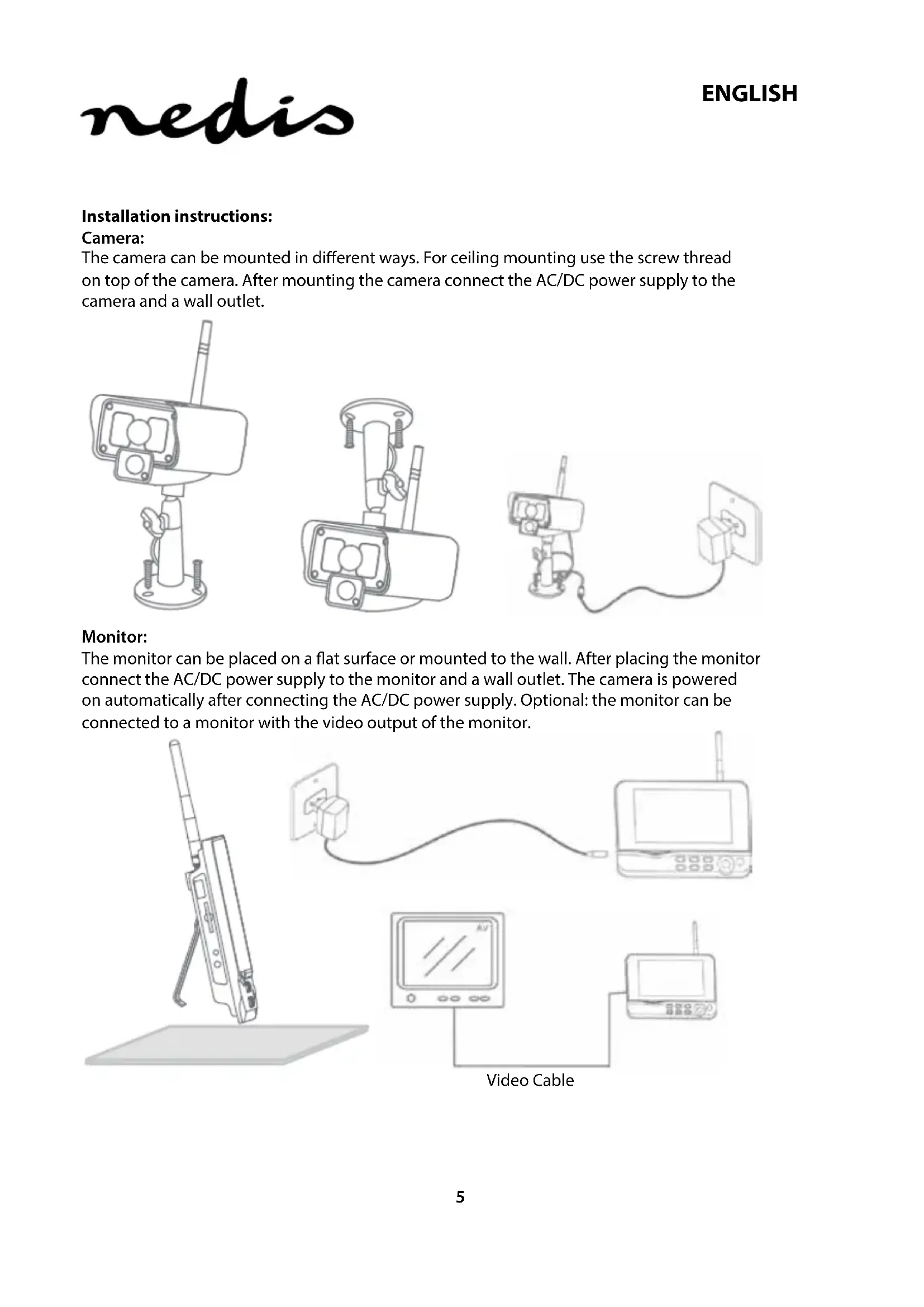 ENGLISH Installation instructions: Camera: The camera can be mounted in dierent ways. For ceiling mounting use the screw thread on top of the camera. After mounting the camera connect the AC/DC power supply to the camera and a wall outlet. Monitor: The monitor can be placed on a at surface or mounted to the wall. After placing the monitor connect the AC/DC power supply to the monitor and a wall outlet. The camera is powered on automatically after connecting the AC/DC power supply. Optional: the monitor can be connected to a monitor with the video output of the monitor. Video Cable6 ENGLISH User instructions: