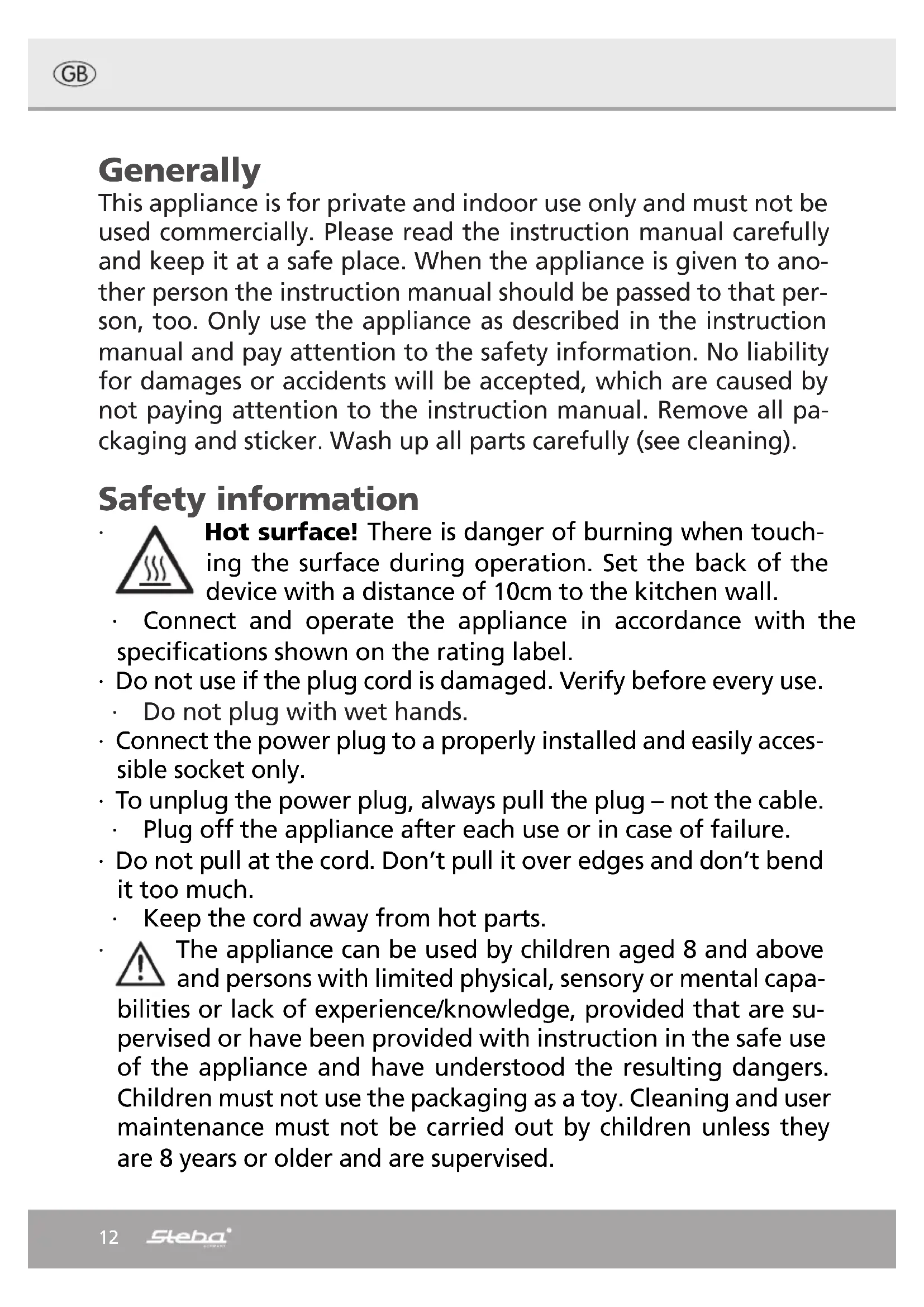 This appliance is for private and indoor use only and must not be used commercially. Please read the instruction manual carefully and keep it at a safe place. When the appliance is given to another person the instruction manual should be passed to that person, too. Only use the appliance as described in the instruction manual and pay attention to the safety information. No liability for damages or accidents will be accepted, which are caused by not paying attention to the instruction manual. Remove all packaging and sticker. Wash up all parts carefully (see cleaning).