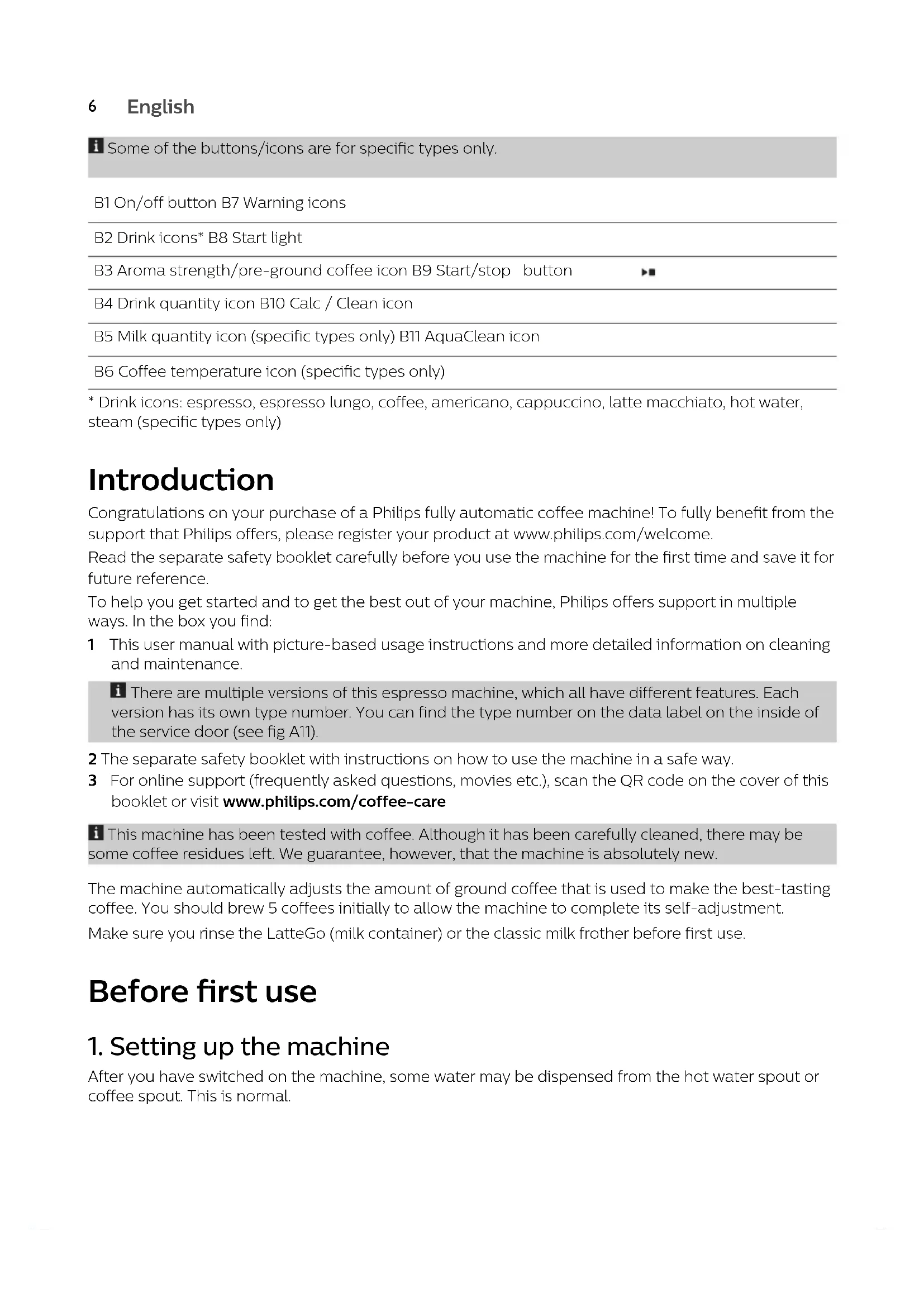 - Drink icons: espresso, espresso lungo, coffee, americano, cappuccino, latte macchiato, hot water, steam (specific types only) Introduction Congratulations on your purchase of a Philips fully automatic coffee machine! To fully benefit from the support that Philips offers, please register your product at www.philips.com/welcome. Read the separate safety booklet carefully before you use the machine for the first time and save it for future reference. To help you get started and to get the best out of your machine, Philips offers support in multiple ways. In the box you find: 1 This user manual with picture-based usage instructions and more detailed information on cleaning and maintenance. There are multiple versions of this espresso machine, which all have different features. Each version has its own type number. You can find the type number on the data label on the inside of the service door (see fig A11). 2 The separate safety booklet with instructions on how to use the machine in a safe way. 3 For online support (frequently asked questions, movies etc.), scan the QR code on the cover of this booklet or visit www.philips.com/coffee-care This machine has been tested with coffee. Although it has been carefully cleaned, there may be some coffee residues left. We guarantee, however, that the machine is absolutely new. The machine automatically adjusts the amount of ground coffee that is used to make the best-tasting coffee. You should brew 5 coffees initially to allow the machine to complete its self-adjustment. Make sure you rinse the LatteGo (milk container) or the classic milk frother before first use. Before first use