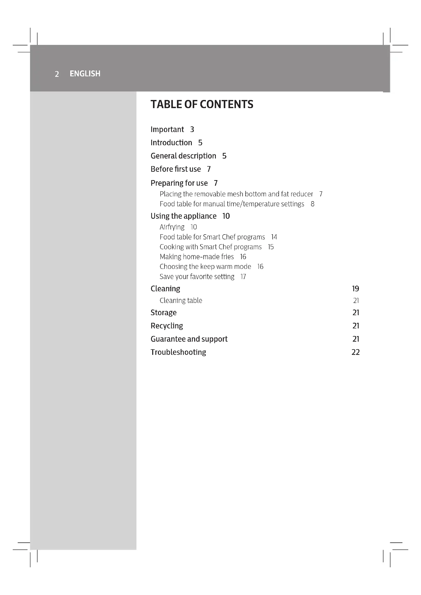 Important 3 Introduction 5 General description 5 Before rst use 7 Preparing for use 7 Placing the removable mesh bottom and fat reducer 7 Food table for manual time/temperature settings 8 Using the appliance 10 Airfrying 10 Food table for Smart Chef programs 14 Cooking with Smart Chef programs 15 Making home-made fries 16 Choosing the keep warm mode 16 Save your favorite setting 17 Cleaning 19 Cleaning table 21 Storage 21 Recycling 21 Guarantee and support 21 Troubleshooting 223 ENGLISH Important Read this important information carefully before you use the appliance and save it for future reference. Danger - Never immerse the appliance in water nor rinse it under the tap. - Do not let any water or other liquid enter the appliance to prevent electric shock. - Always put the ingredients to be fried in the basket, to prevent them from coming into contact with the heating elements. - Do not cover the air inlet and the air outlet openings while the appliance is operating. - Do not ll the pan with oil as this may cause a re hazard. - Do not use the appliance, if the plug, the mains cord or the appliance itself is damaged. - Never touch the inside of the appliance while it is operating. - Never put any amount of food that exceeds the maximum level indicated in the basket. - Always make sure heater is free and no food stuck in heater. Warning - If the supply cord is damaged, it must be replaced by Philips, its service agent or similarly qualied persons in order to avoid a hazard. - Only connect the appliance to an earthed wall socket. Always make sure that the plug is inserted into the wall socket properly. - This appliance is not intended to be operated by means of an external timer or a separate remote-control system. - The accessible surfaces may become hot during use. - This appliance can be used by children aged from 8 years and above and persons with reduced physical, sensory or mental capabilities or lack of experience and knowledge if they have been given supervision or instruction concerning use of the appliance in a safe way and understand the hazards involved. Children shall not play with the appliance. Cleaning and user maintenance shall not be made by children unless they are older than 8 and supervised. - Keep the appliance and its cord out of the reach of children less than 8 years. - Do not place the appliance against a wall or against other appliances. Leave at least 10 cm free space at the back, on both sides and above the appliance. Do not place anything on top of the appliance. - During hot air frying, hot steam is released through the air outlet openings. Keep your hands and face at a safe distance from the steam and from the air outlet openings. Also, be careful of hot steam and air when you remove the pan from the appliance. - Never use light ingredients or packing paper in the appliance. - Accessible surfaces may become hot during use.4 ENGLISH - Storage of potatoes: The temperature shall be appropriate to the potato variety stored and it shall be above 6°C to minimize the risk of acrylamide exposure in the prepared foodstu. - Do not place the appliance on or near a hot gas stove or all kinds of electric stove and electric cooking plates, or in a heated oven. - Never ll the pan with oil. - This appliance is designed to be used at ambient temperatures between 5°C and 40°C. - Check if the voltage indicated on the appliance corresponds to the local mains voltage before you connect the appliance. - Keep the mains cord away from hot surfaces. - Do not place the appliance on or near combustible materials such as a tablecloth or curtain. - Do not use the appliance for any other purpose than described in this manual and use only original Philips-accessories. - Do not let the appliance operate unattended. - The pan, basket and fat reducer becomes hot during and after use of the appliance, always handle carefully. - Thoroughly clean the parts that come into contact with food before you use the appliance for the rst time. Refer to the instructions in the manual. Caution - This appliance is intended for normal household use only. It is not intended for use in environments such as sta kitchens of shops, oces, farms or other work environments. Nor is it intended to be used by clients in hotels, motels, bed and breakfasts and other residential environments. - Always disconnect the appliance from the supply if it is left unattended and before you assemble, disassemble, store or cleaning. - Place the appliance on a horizontal, even and stable surface. - If the appliance is used improperly or for professional or semi- professional purposes or if it is not used according to the instructions in the user manual, the guarantee becomes invalid and Philips refuses any liability for damage caused. - Always return the appliance to a service center authorised by Philips for examination or repair. Do not attempt to repair the appliance yourself, otherwise the guarantee becomes invalid. - Always unplug the appliance after use. - Let the appliance cool down for approximately 30 minutes before you handle or clean it. - Make sure the ingredients prepared in this appliance come out golden yellow instead of dark or brown. Remove burnt remnants. Do not fry fresh potatoes at a temperature above 180°C (to minimise the production of acrylamide). Electromagnetic elds (EMF) This Philips appliance complies with all applicable standards and regulations regarding electromagnetic elds.5 ENGLISH Automatic shut-o This appliance is equipped with an automatic shut-o function. When the time of the timer has elapsed, the device will shut o automatically. If you do not press a button within 30 minutes, the appliance switches o automatically. To switch o the appliance manually, press the power On/o button. Introduction Congratulations on your purchase and welcome to Philips! To fully benet from the support that Philips oers, register your product at www.philips.com/welcome. With Philips Airfryer, you can now enjoy perf