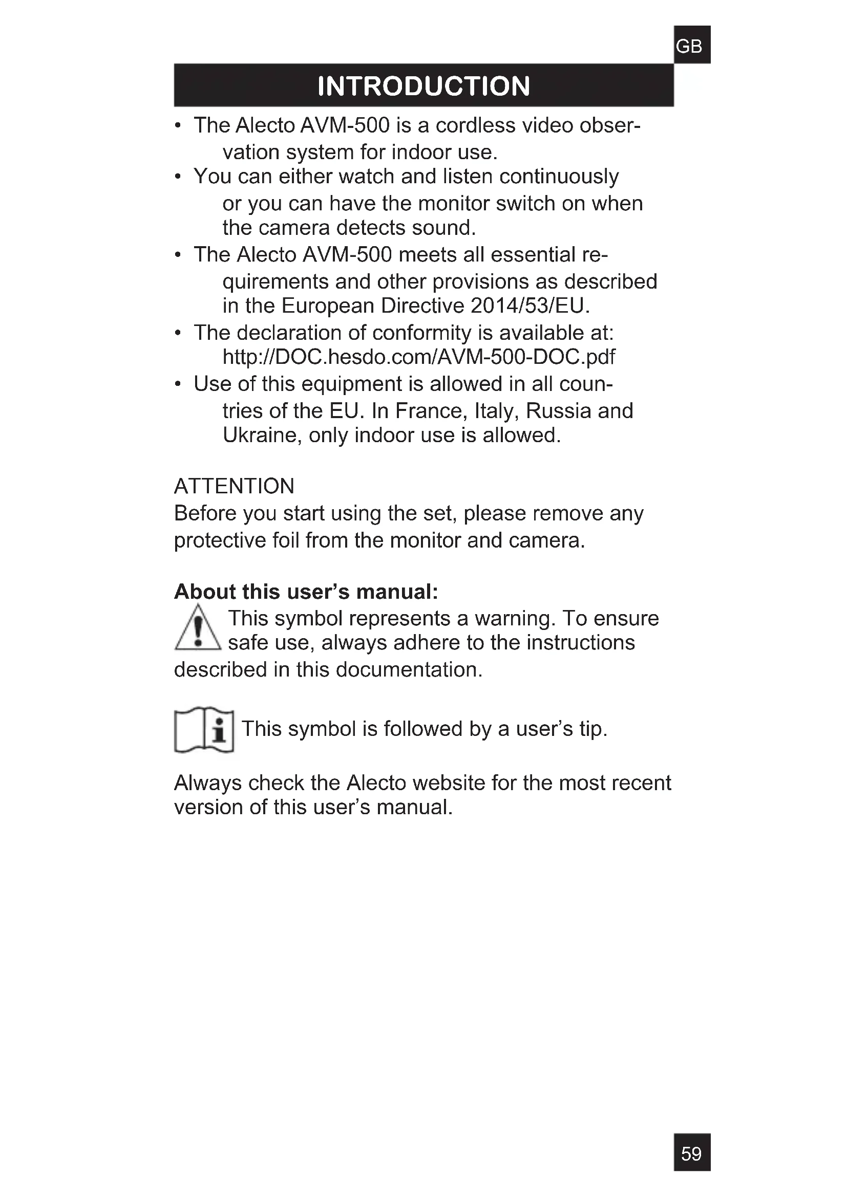 - Use of this equipment is allowed in all coun- tries of the EU. In France, Italy, Russia and Ukraine, only indoor use is allowed. ATTENTION Before you start using the set, please remove any protective foil from the monitor and camera. About this user’s manual: This symbol represents a warning. To ensure safe use, always adhere to the instructions described in this documentation. This symbol is followed by a user’s tip. Always check the Alecto website for the most recent version of this user’s manual.60