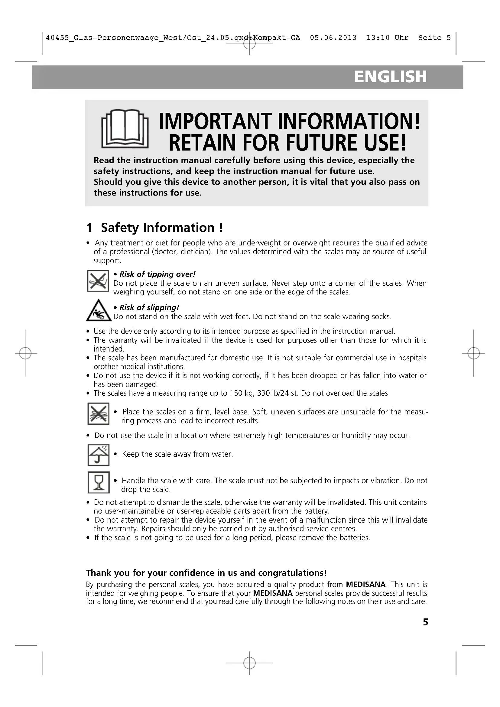 40455_Glas-Personenwaage_West/Ost_24.05.qxd:Kompakt-GA 05.06.2013 13:10 Uhr Seite 4ENGLISHENGLISHENGLISH IMPORTANT INFORMATION! RETAIN FOR FUTURE USE! Read the instruction manual carefully before using this device, especially the safety instructions, and keep the instruction manual for future use. Should you give this device to another person, it is vital that you also pass on these instructions for use. ENGLISH 1 Safety Information !