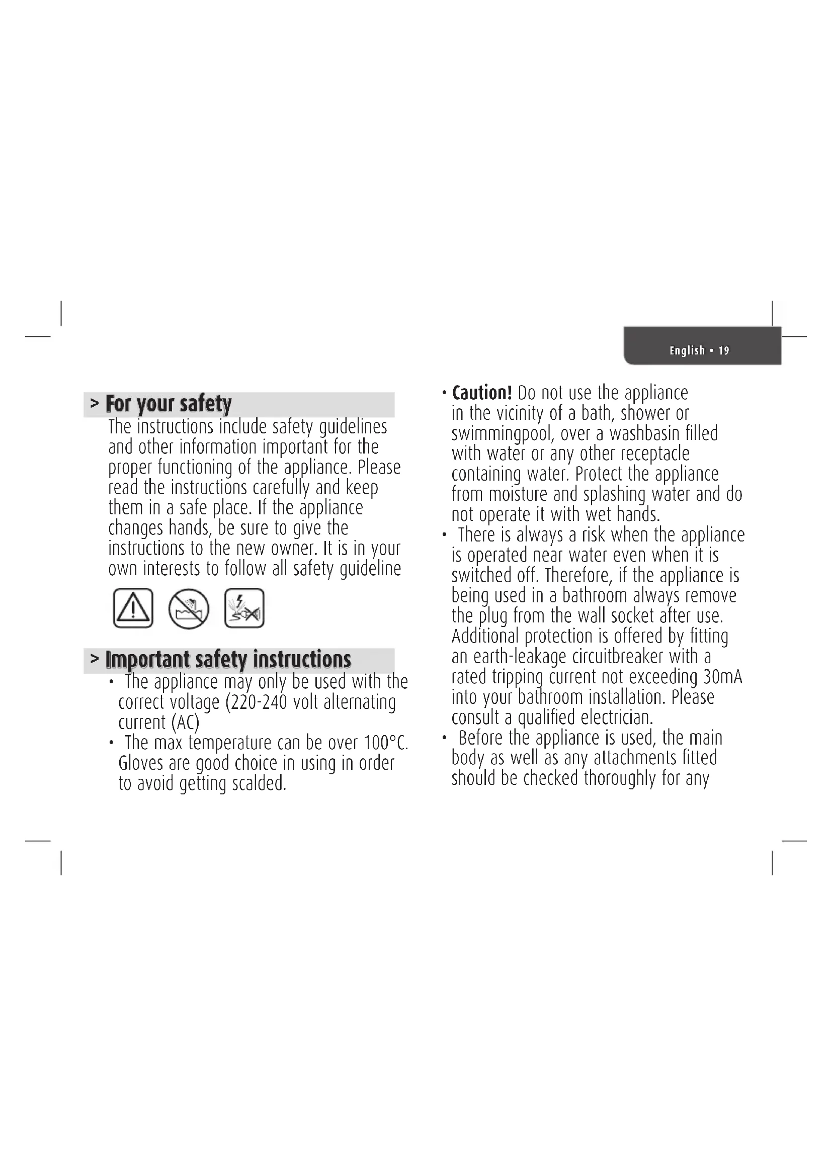 - There is always a risk when the appliance is operated near water even when it is switched off. Therefore, if the appliance is being used in a bathroom always remove the plug from the wall socket after use. Additional protection is offered by fitting an earth-leakage circuitbreaker with a rated tripping current not exceeding 30mA into your bathroom installation. Please consult a qualified electrician.