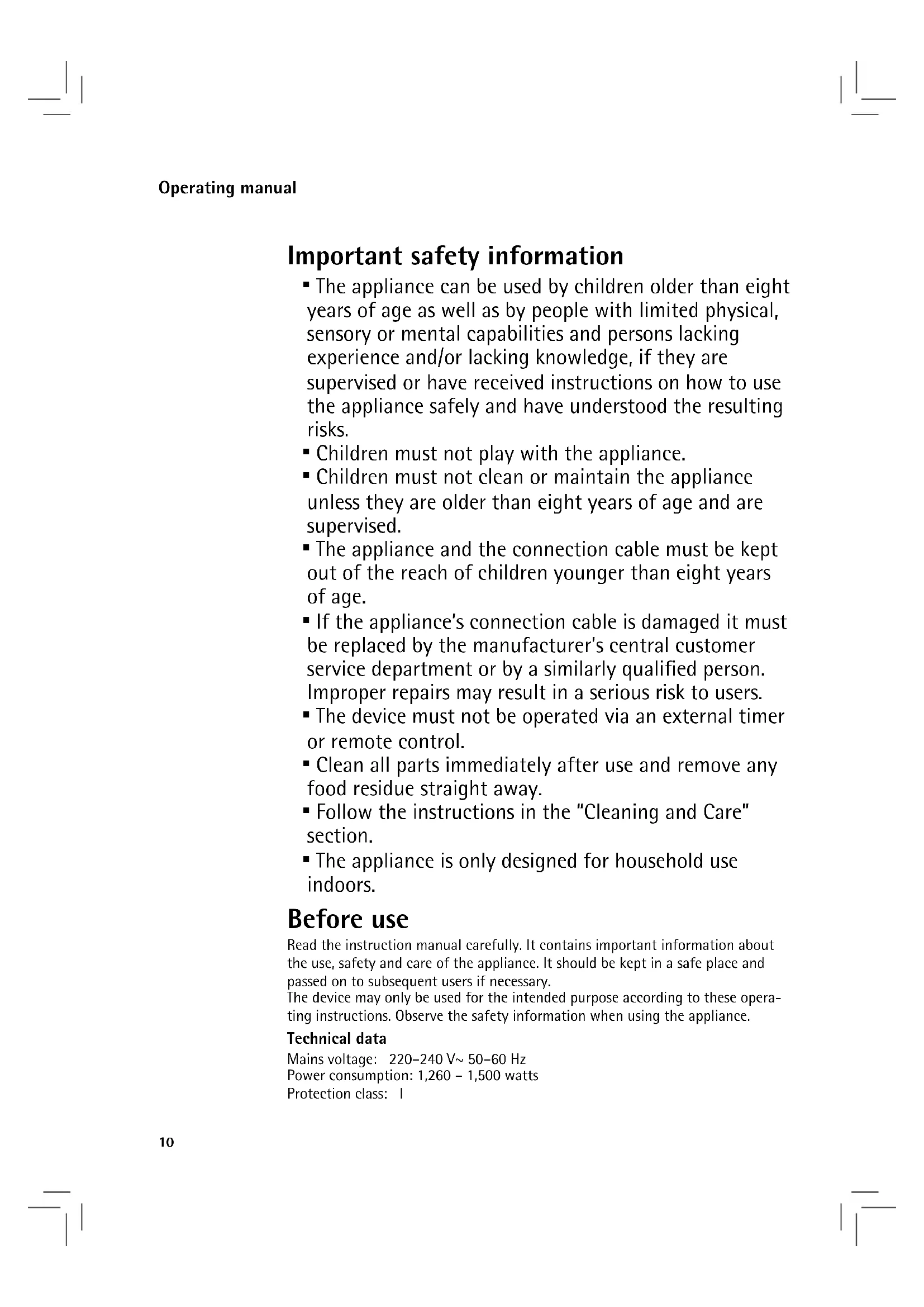 - The appliance is only designed for household use indoors. Before use Read the instruction manual carefully. It contains important information about the use, safety and care of the appliance. It should be kept in a safe place and passed on to subsequent users if necessary. The device may only be used for the intended purpose according to these opera- ting instructions. Observe the safety information when using the appliance. Technical data Mains voltage: 220–240 V~ 50–60 Hz Power consumption: 1,260 – 1,500 watts Protection class: I11