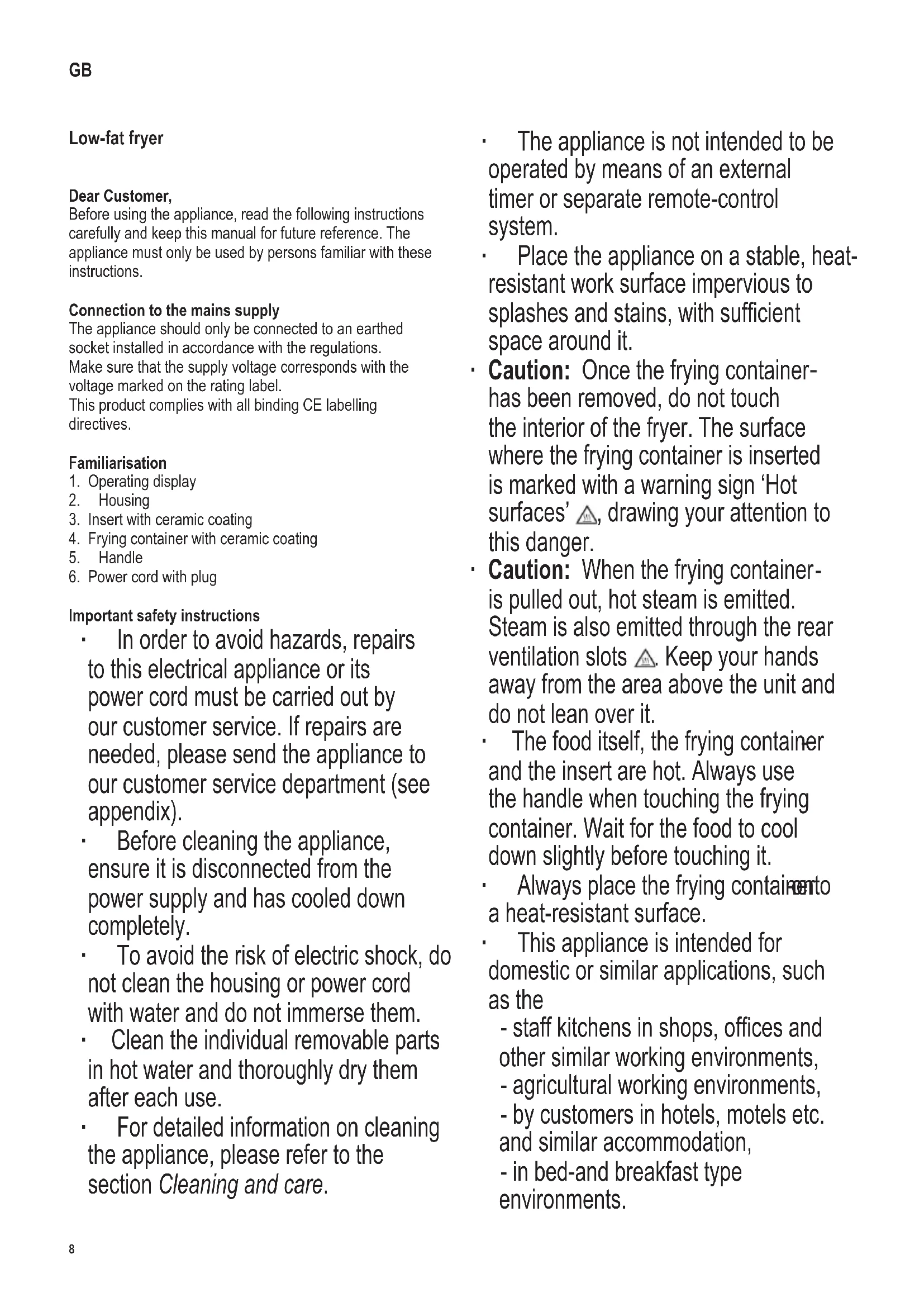 Important safety instructions ∙ In order to avoid hazards, repairs to this electrical appliance or its power cord must be carried out by our customer service. If repairs are needed, please send the appliance to our customer service department (see appendix). ∙ Before cleaning the appliance, ensure it is disconnected from the power supply and has cooled down completely. ∙ To avoid the risk of electric shock, do not clean the housing or power cord with water and do not immerse them. ∙ Clean the individual removable parts in hot water and thoroughly dry them after each use. ∙ For detailed information on cleaning the appliance, please refer to the section Cleaning and care. ∙ The appliance is not intended to be operated by means of an external timer or separate remote-control system. ∙ Place the appliance on a stable, heat- resistant work surface impervious to splashes and stains, with sufcient space around it. ∙ Caution: Once the frying container has been removed, do not touch the interior of the fryer. The surface where the frying container is inserted is marked with a warning sign ‘Hot surfaces’ , drawing your attention to this danger. ∙ Caution: When the frying container is pulled out, hot steam is emitted. Steam is also emitted through the rear ventilation slots . Keep your hands away from the area above the unit and do not lean over it. ∙ The food itself, the frying container and the insert are hot. Always use the handle when touching the frying container. Wait for the food to cool down slightly before touching it. ∙ Always place the frying container onto a heat-resistant surface. ∙ This appliance is intended for domestic or similar applications, such as the - staff kitchens in shops, ofces and other similar working environments, - agricultural working environments, - by customers in hotels, motels etc. and similar accommodation, - in bed-and breakfast type environments. GB9 142 x 208 mm ∙ This appliance may be used by children (at least 8 years of age) and by persons with reduced physical, sensory or mental capabilities, or lacking experience and knowledge, provided they have been given supervision or instruction concerning the use of the appliance and fully understand all dangers and safety precautions involved. ∙ Children must not be permitted to carry out any cleaning or maintenance work on the appliance unless they are supervised and at least 8 years of age. ∙ Children must not be permitted to play with the appliance. ∙ The appliance and its power cord must be kept well away from children under 8 at all times. ∙ Caution: Keep any packaging materials well away from children - such materials are a potential source of danger, e.g. of suffocation. ∙ Do not leave the deep fryer unattended while in use. ∙ Do not operate the fryer without the insert tted in the frying container. ∙ Every time the appliance is used, the main body including the power cord as well as any attachment tted should be checked thoroughly for any defects. Should the appliance, for instance, have been dropped onto a hard surface, or if excessive force has been used to pull the power cord, it must no longer be used: even invisible damage may have adverse effects on the operational safety of the appliance. In this case, please contact our customer service. ∙ Do not place the appliance underneath any wall- cupboards or hanging objects, nor directly by a wall or in a corner. ∙ Ensure that no inammable materials are stored in the vicinity. ∙ Caution: Do not cover the ventilation slots. ∙ Caution: Do not allow the appliance or its power cord to touch hot surfaces or to come into contact with any heat sources. Do not allow the power cord to hang free; the cord must be kept well away from hot parts of the appliance. ∙ Let the appliance cool down sufciently before moving it. ∙ Always remove the plug from the wall socket - after use, - in case of any malfunction, and - before cleaning the appliance. ∙ When removing the plug from the wall socket, never pull on the power cord; always grip the plug itself. ∙ Do not use metal kitchen utensils when adding or removing food, so as to avoid scratching the surface. ∙ No responsibility will be accepted if damage results from improper use, or if these instructions are not complied with. Intended use ∙ This appliance must only be used for cooking food. Any other use must be considered improper and may lead to personal injuries or material damage. ∙ Unlike conventional deep-fryers, this appliance is not intended to be used with oil or fat. Before using for the rst time ∙ Before using the appliance for the rst time, remove any remaining packaging materials and promotional stickers. ∙ Heat the appliance for 15 minutes to 200 °C without any food. This will lessen the inherent smell of the appliance. ∙ Ensure adequate ventilation by opening windows or balcony doors. ∙ Clean the appliance afterwards as described in Cleaning and care. Operating display Display - Cooking / Hot-air Display - Temperature Display - Remaining running time Selector keys - Temperature/Time increase/decrease Selector key - On/Off & Start/Stop Selector key - Temperature/Time10 142 x 208 mm Preparing the unit