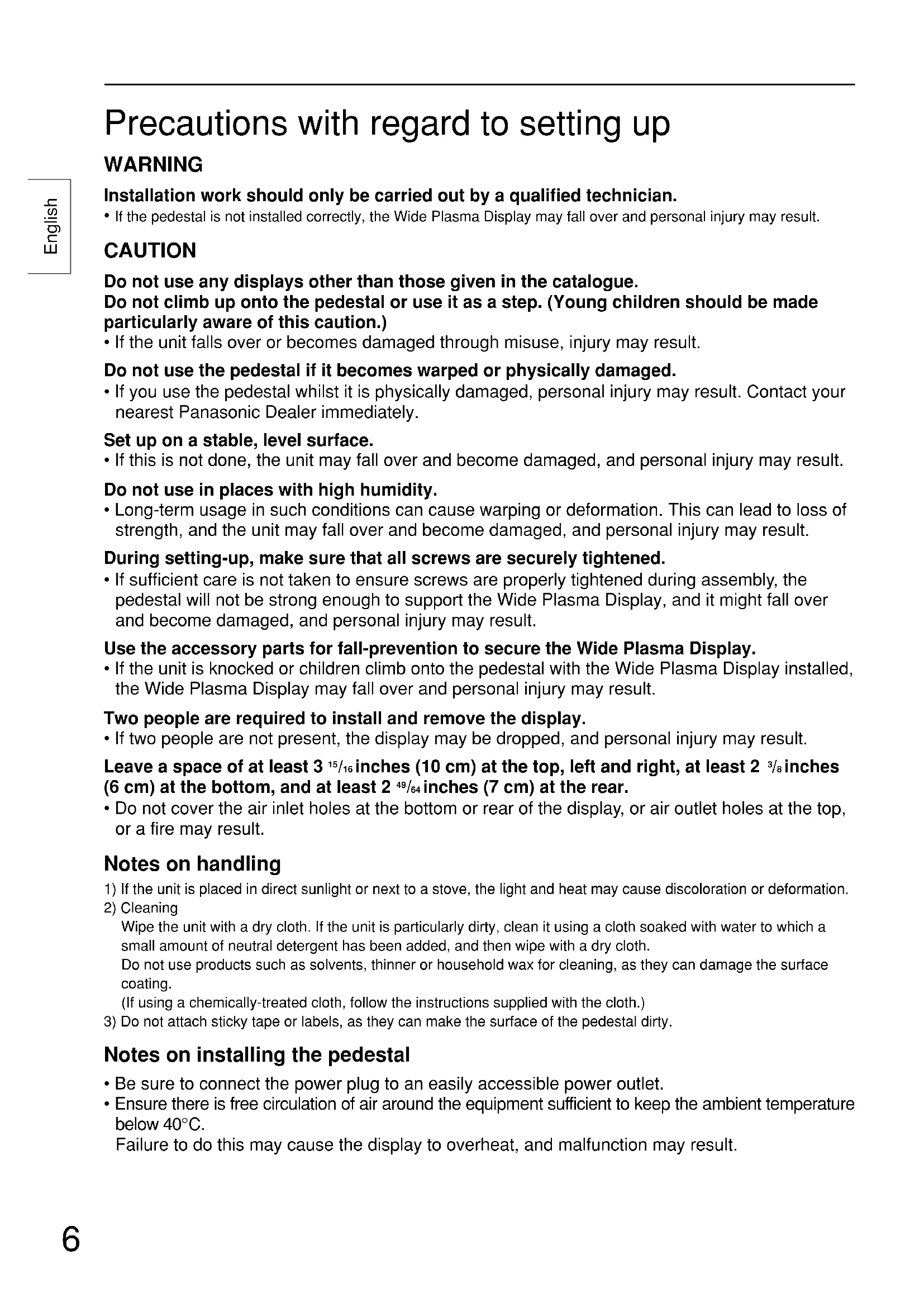 - If the pedestal is not installed correctly, the Wide Plasma Display may fall over and personal injury may result. CAUTION Do not use any displays other than those given in the catalogue. Do not climb up onto the pedestal or use it as a step. (Young children should be made particularly aware of this caution.)