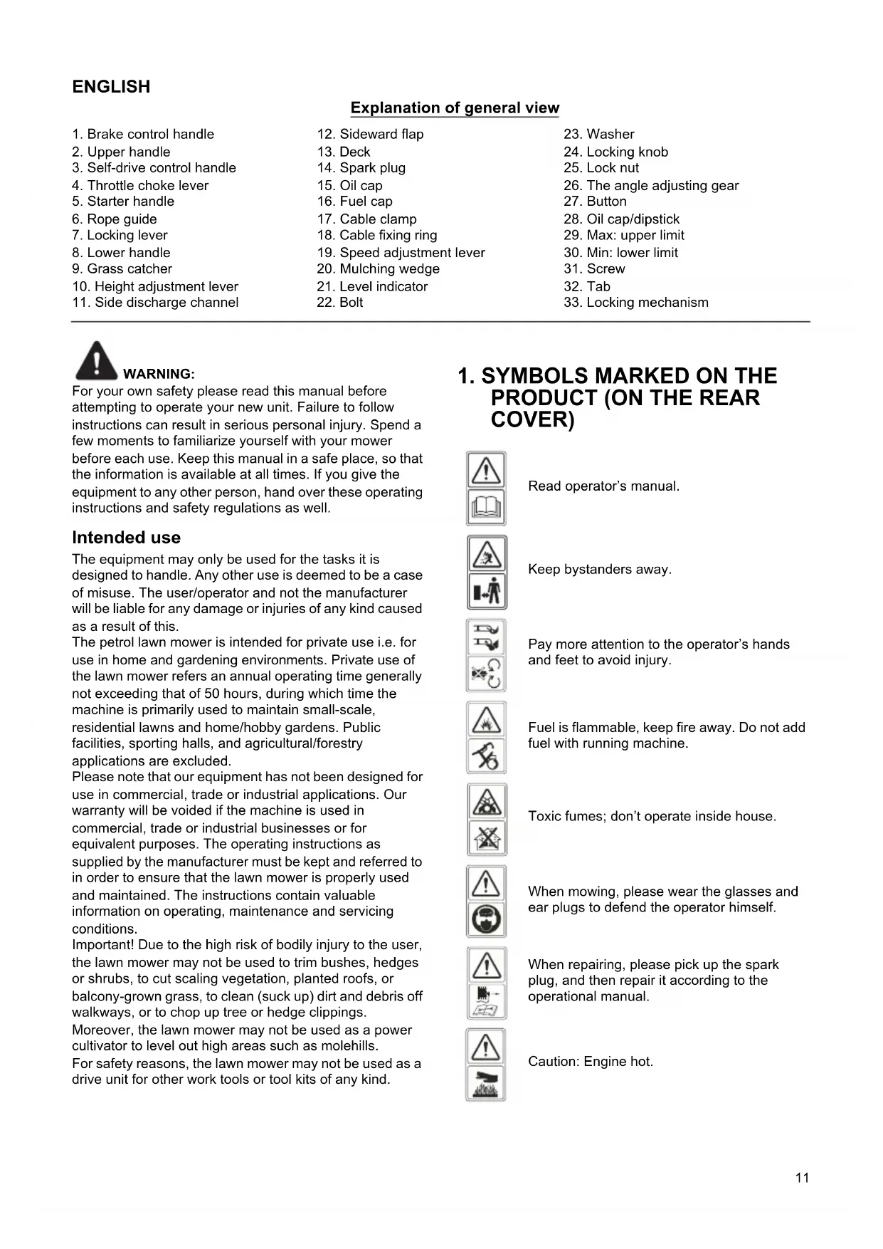 For your own safety please read this manual before attempting to operate your new unit. Failure to follow instructions can result in serious personal injury. Spend a few moments to familiarize yourself with your mower before each use. Keep this manual in a safe place, so that the information is available at all times. If you give the equipment to any other person, hand over these operating instructions and safety regulations as well. Intended use The equipment may only be used for the tasks it is designed to handle. Any other use is deemed to be a case of misuse. The user/operator and not the manufacturer will be liable for any damage or injuries of any kind caused as a result of this. The petrol lawn mower is intended for private use i.e. for use in home and gardening environments. Private use of the lawn mower refers an annual operating time generally not exceeding that of 50 hours, during which time the machine is primarily used to maintain small-scale, residential lawns and home/hobby gardens. Public facilities, sporting halls, and agricultural/forestry applications are excluded. Please note that our equipment has not been designed for use in commercial, trade or industrial applications. Our warranty will be voided if the machine is used in commercial, trade or industrial businesses or for equivalent purposes. The operating instructions as supplied by the manufacturer must be kept and referred to in order to ensure that the lawn mower is properly used and maintained. The instructions contain valuable information on operating, maintenance and servicing conditions. Important! Due to the high risk of bodily injury to the user, the lawn mower may not be used to trim bushes, hedges or shrubs, to cut scaling vegetation, planted roofs, or balcony-grown grass, to clean (suck up) dirt and debris off walkways, or to chop up tree or hedge clippings. Moreover, the lawn mower may not be used as a power cultivator to level out high areas such as molehills. For safety reasons, the lawn mower may not be used as a drive unit for other work tools or tool kits of any kind.