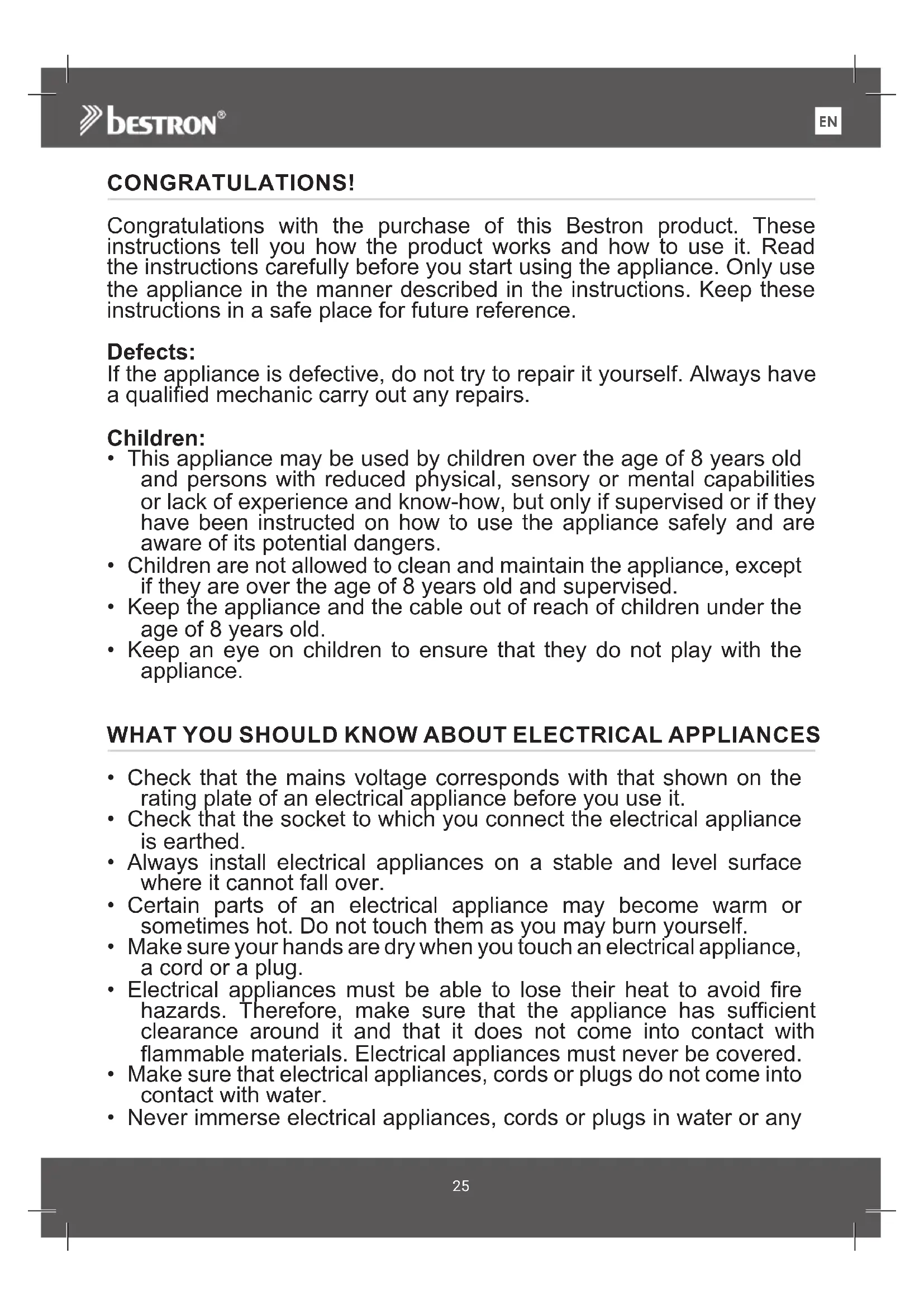 CONGRATULATIONS! Congratulations with the purchase of this Bestron product. These instructions tell you how the product works and how to use it. Read the instructions carefully before you start using the appliance. Only use the appliance in the manner described in the instructions. Keep these instructions in a safe place for future reference. Defects: If the appliance is defective, do not try to repair it yourself. Always have a qualified mechanic carry out any repairs. Children: