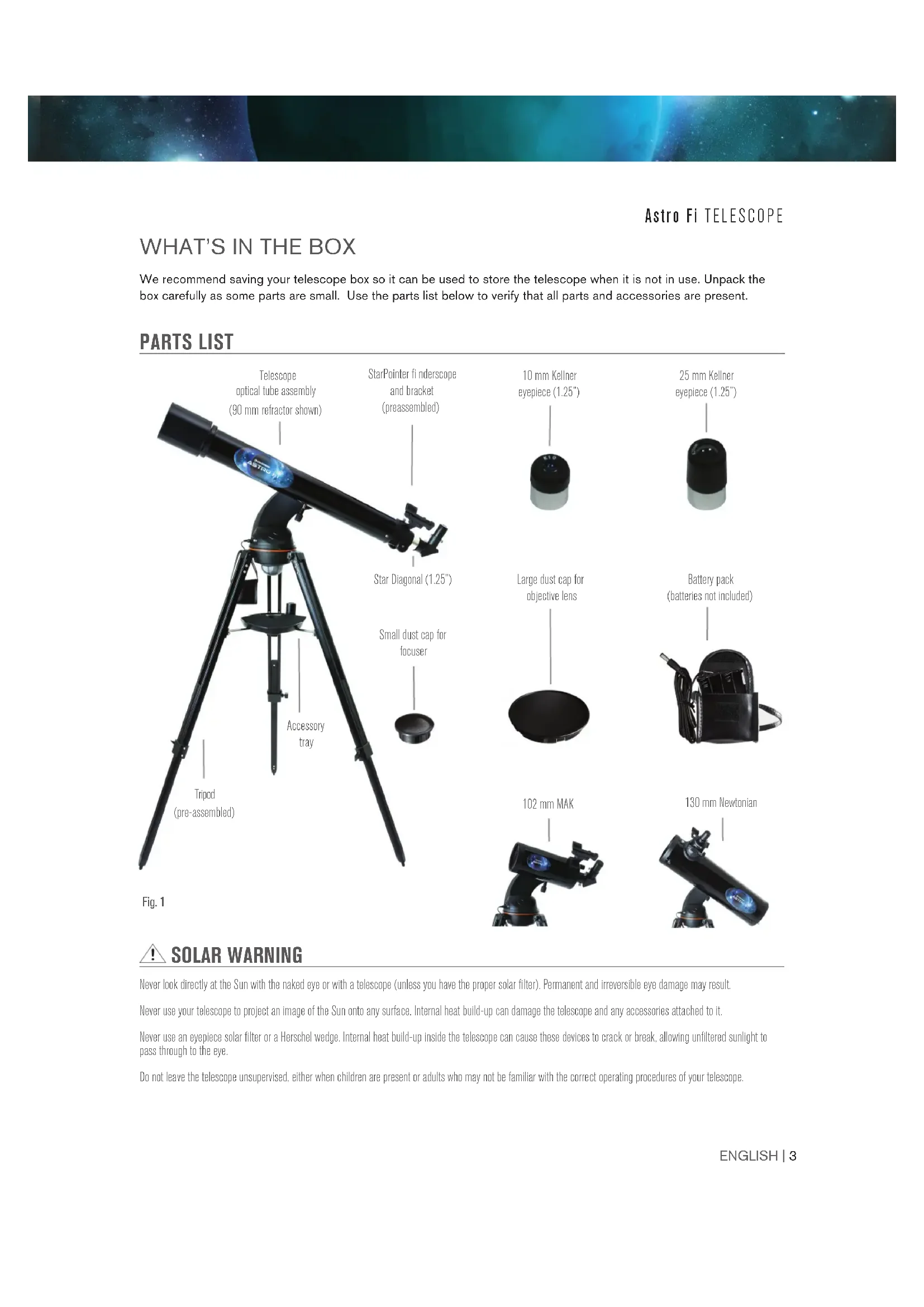 INSTRUCTION MANUAL MODEL # 22201, 22202, 22203 90 mm Refractor 102 mm Maksutov 130 mm Newtonian2 | ENGLISH Astro Fi TELESCOPEENGLISH | 3 Astro Fi TELESCOPE StarPointer fi nderscope and bracket (preassembled) SOLAR WARNING Never look directly at the Sun with the naked eye or with a telescope (unless you have the proper solar fi lter). Permanent and irreversible eye damage may result. Never use your telescope to project an image of the Sun onto any surface. Internal heat build-up can damage the telescope and any accessories attached to it. Never use an eyepiece solar fi lter or a Herschel wedge. Internal heat build-up inside the telescope can cause these devices to crack or break, allowing unfi ltered sunlight to pass through to the eye. Do not leave the telescope unsupervised, either when children are present or adults who may not be familiar with the correct operating procedures of your telescope. We recommend saving your telescope box so it can be used to store the telescope when it is not in use. Unpack the box carefully as some parts are small. Use the parts list below to verify that all parts and accessories are present. PARTS LIST