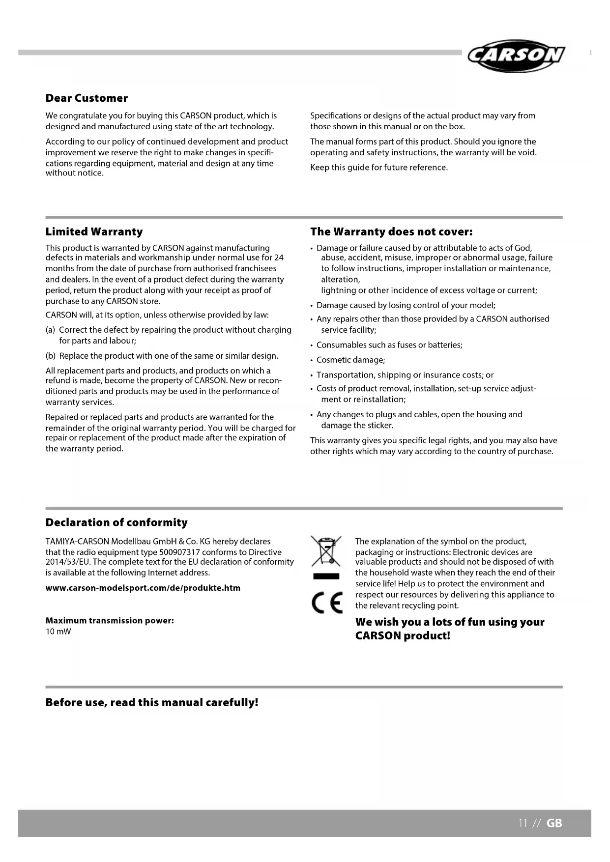 - Any changes to plugs and cables, open the housing and damage the sticker. This warranty gives you specific legal rights, and you may also have other rights which may vary according to the country of purchase. Before use, read this manual carefully! TAMIYA-CARSON Modellbau GmbH & Co. KG hereby declares that the radio equipment type 500907317 conforms to Directive 2014/53/EU. The complete text for the EU declaration of conformity is available at the following Internet address. www.carson-modelsport.com/de/produkte.htm Maximum transmission power: 10 mW The explanation of the symbol on the product, packaging or instructions: Electronic devices are valuable products and should not be disposed of with the household waste when they reach the end of their service life! Help us to protect the environment and respect our resources by delivering this appliance to the relevant recycling point. We wish you a lots of fun using your CARSON product! Declaration of conformityGB // 12