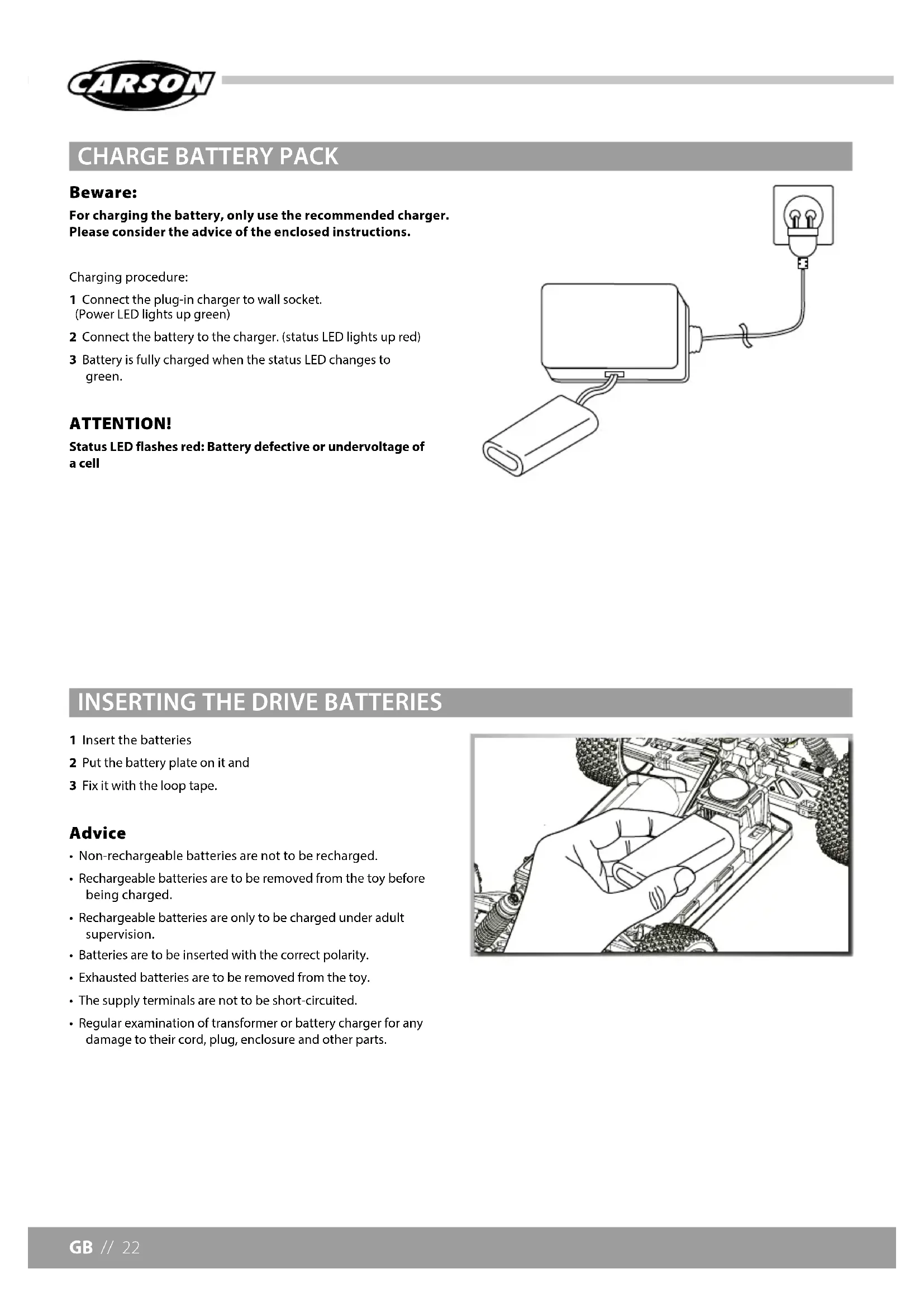 - Never try to charge non-rechargeable batteries (dry cells), only batteries specified as rechargeable can be charged. Safety Instructions and Intended Use This product is designed exclusively for hobby use and may only be used on tracks and areas intended for this purpose. No persons or animals may be transported with this model. To avoid operator errors, it is mandatory that the user manual is read before use! These models may only be used with bodywork that is correctly fitted. When removing the bodywork, please note that, during operation, certain parts can become very hot. Please note that various models can generate very high noise levels and should, therefore, not be operated in your immediate proximity. Please make sure, before every driving session, that the tank is correctly closed or the power pack is correctly inserted. To avoid faulty operation of the control system causing the model to run out of control, it must be checked that the transmitter and model batteries are in good condition. It is essential to check that the model is correctly assembled both before and after use; if need be, tighten nuts and bolts. SAFETY PRECAUTIONSGB // 20