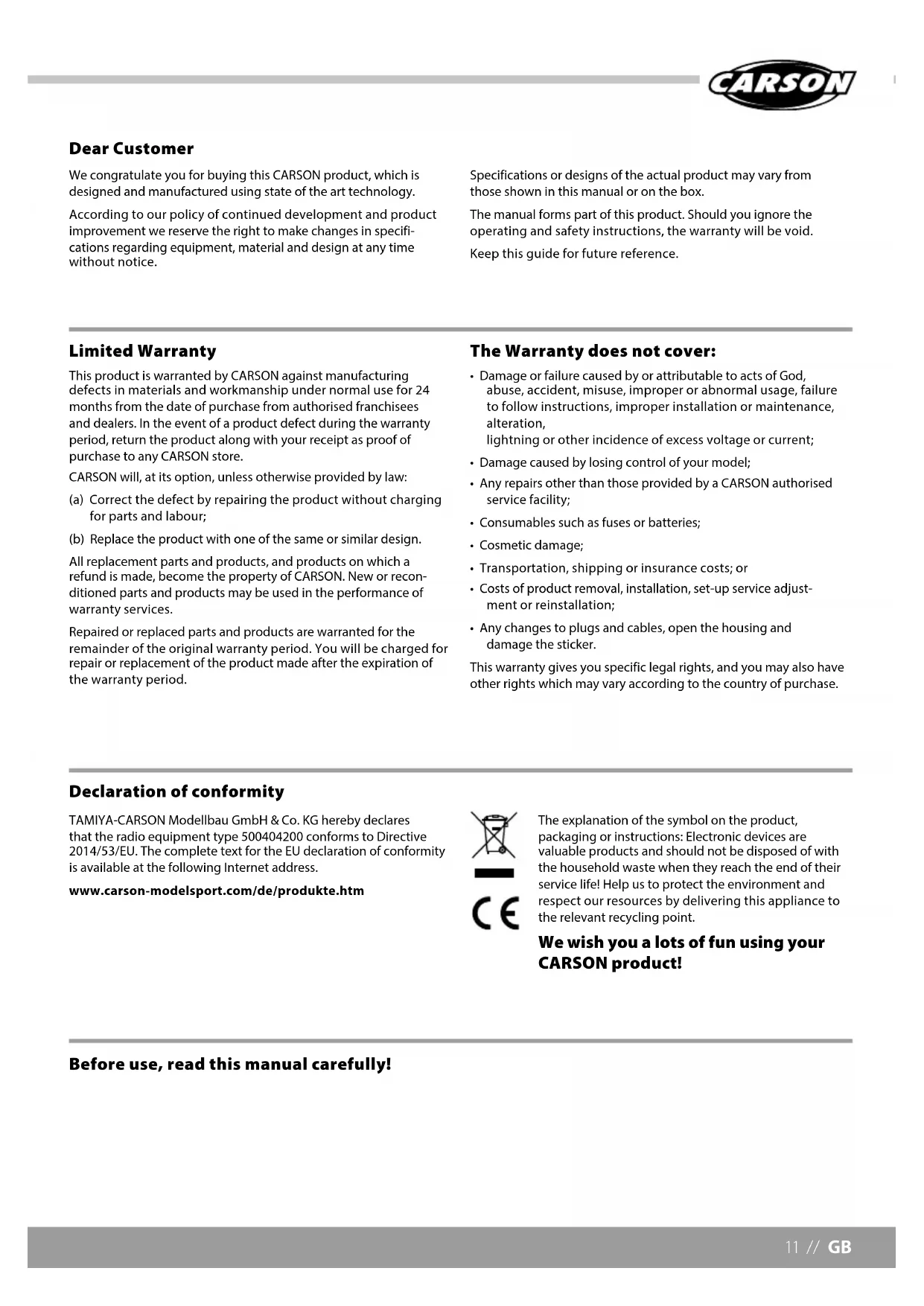 - Any changes to plugs and cables, open the housing and damage the sticker. This warranty gives you specific legal rights, and you may also have other rights which may vary according to the country of purchase. Before use, read this manual carefully! TAMIYA-CARSON Modellbau GmbH & Co. KG hereby declares that the radio equipment type 500404200 conforms to Directive 2014/53/EU. The complete text for the EU declaration of conformity is available at the following Internet address. www.carson-modelsport.com/de/produkte.htm The explanation of the symbol on the product, packaging or instructions: Electronic devices are valuable products and should not be disposed of with the household waste when they reach the end of their service life! Help us to protect the environment and respect our resources by delivering this appliance to the relevant recycling point. We wish you a lots of fun using your CARSON product! Declaration of conformityGB // 12