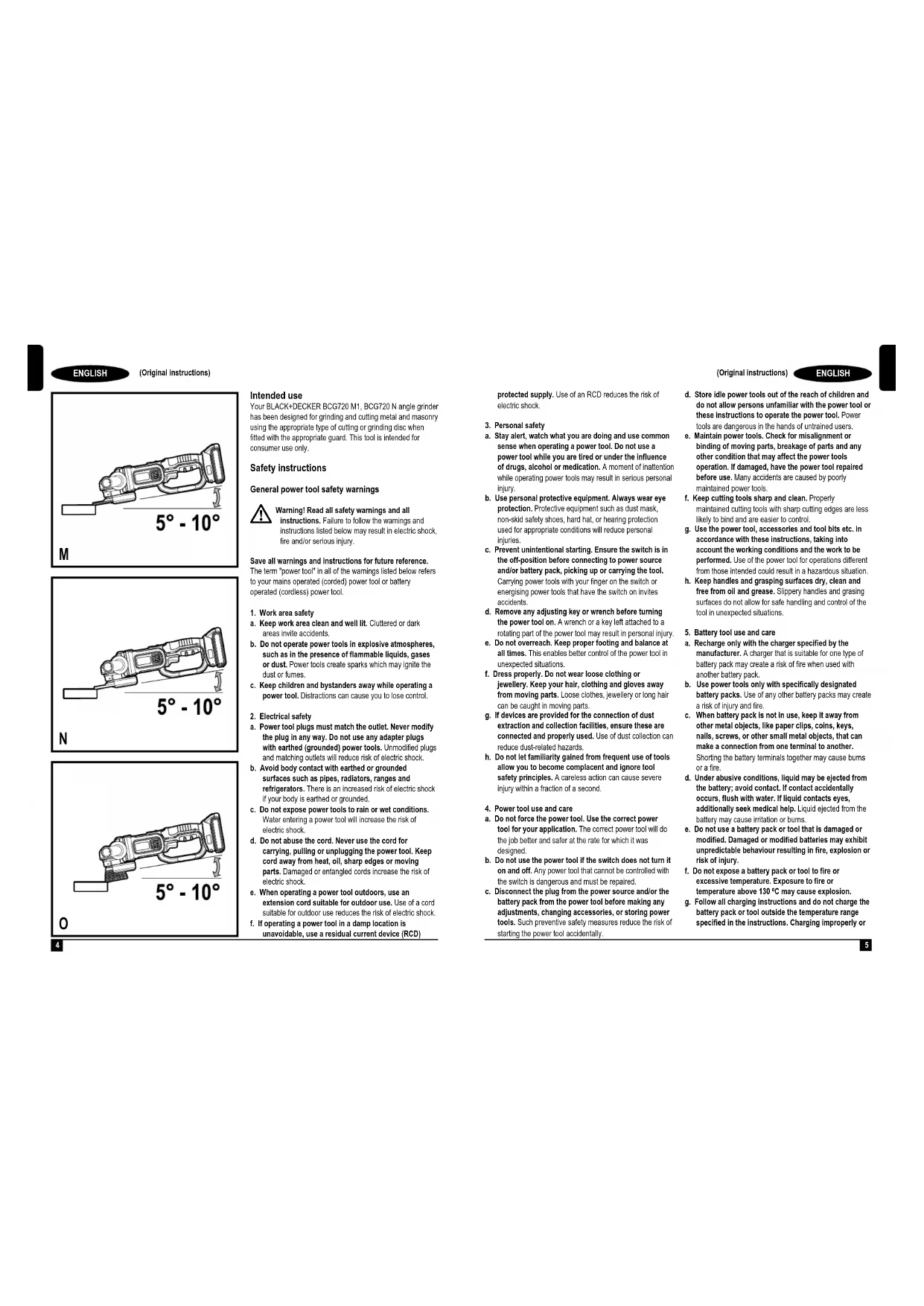 ENGLISH (Original instructions) Intended use Your BLACK+DECKER BCG720 M1, BCG720 N angle grinder has been designed for grinding and cutting metal and masonry using the appropriate type of cutting or grinding disc when tted with the appropriate guard. This tool is intended for consumer use only. Safety instructions General power tool safety warnings