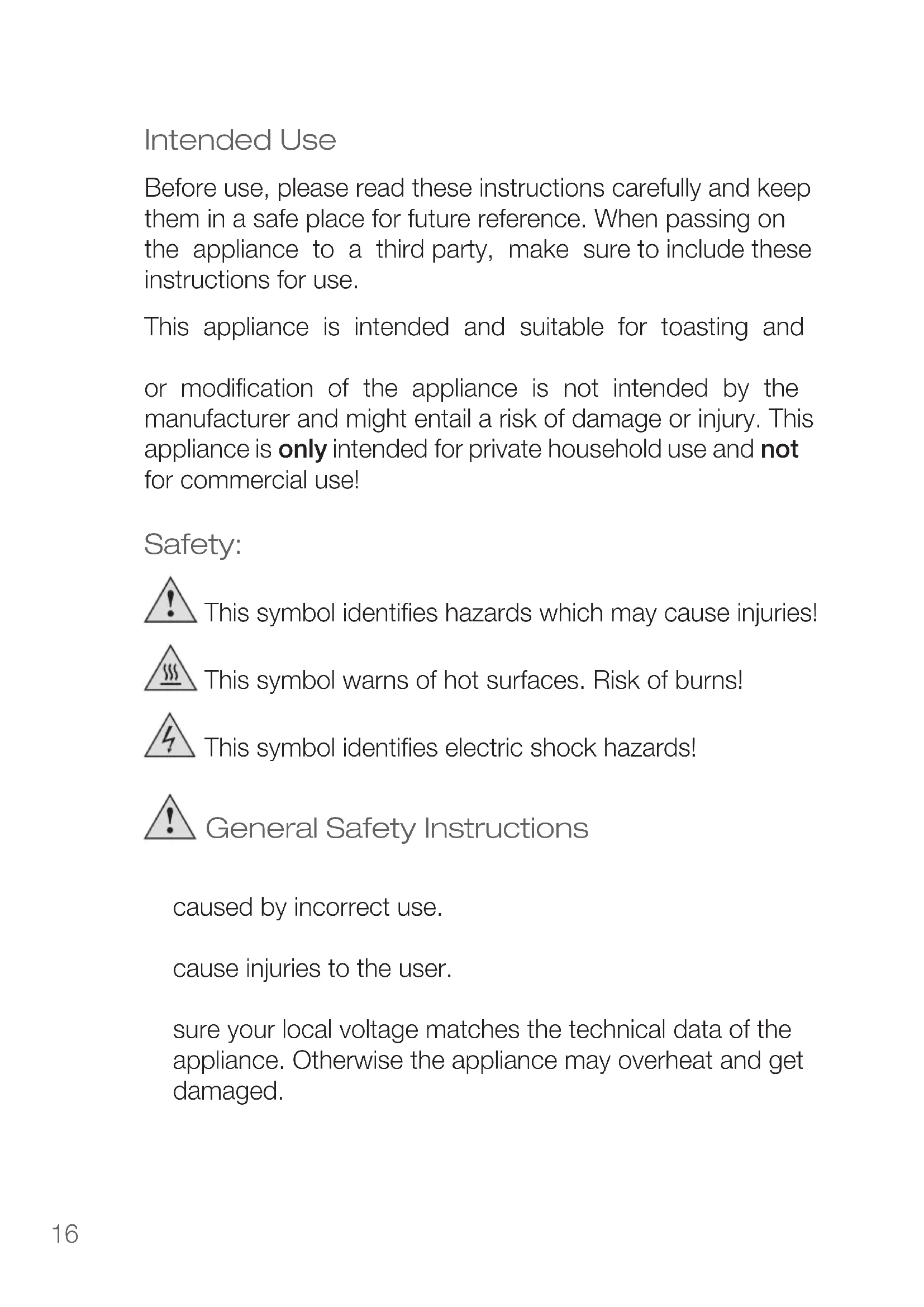 or modification of the appliance is not intended by the manufacturer and might entail a risk of damage or injury. This appliance is only intended for private household use and not for commercial use!