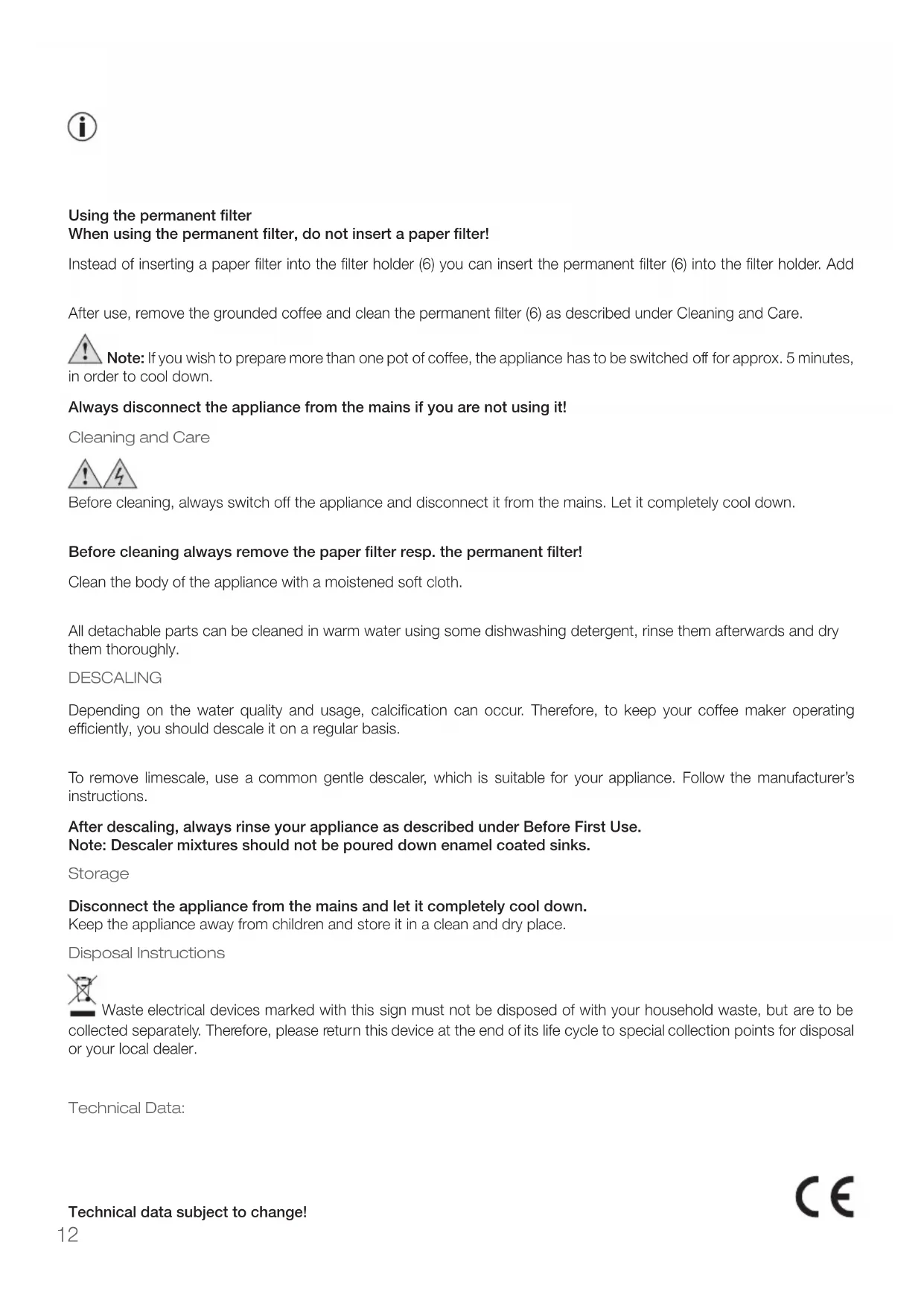 Attention:Theappliancewillautomaticallyshut-offwithin40minutesandtheindicatorlightwillgoOFFaswell. Oncetheappliancehasautomaticallyshut-off,thekeepingwarmfunctionisalsodeactivated. 9.Toswitchofftheappliancebeforetheautomaticshut-off,presstheOn/Offbutton(3). Using the permanent filter When using the permanent filter, do not insert a paper filter! Instead of inserting a paper filter into the filter holder (6) you can insert the permanent filter (6) into the filter holder. Add yourgroundedcoffeeandfollowsteps5–9. After use, remove the grounded coffee and clean the permanent filter (6) as described under Cleaning and Care. Note: If you wish to prepare more than one pot of coffee, the appliance has to be switched off for approx. 5 minutes, in order to cool down. Always disconnect the appliance from the mains if you are not using it! Cleaning and Care Before cleaning, always switch off the appliance and disconnect it from the mains. Let it completely cool down. Neverimmersetheapplianceinwater.Danger! Electric Shock! Before cleaning always remove the paper filter resp. the permanent filter! Clean the body of the appliance with a moistened soft cloth. Do notuseanyaggressivecleaningagentsand/orotherhardobjectstocleantheappliance. All detachable parts can be cleaned in warm water using some dishwashing detergent, rinse them afterwards and dry them thoroughly. DESCALING Depending on the water quality and usage, calcification can occur. Therefore, to keep your coffee maker operating efficiently, you should descale it on a regular basis. Neveruseanysharp,pointedormetalobjectstoremovelimescalebuiltupintheappliance. To remove limescale, use a common gentle descaler, which is suitable for your appliance. Follow the manufacturer’s instructions. After descaling, always rinse your appliance as described under Before First Use. Note: Descaler mixtures should not be poured down enamel coated sinks. Storage Disconnect the appliance from the mains and let it completely cool down. Keep the appliance away from children and store it in a clean and dry place. Disposal Instructions Waste electrical devices marked with this sign must not be disposed of with your household waste, but are to be collected separately. Therefore, please return this device at the end of its life cycle to special collection points for disposal or your local dealer. YourCoffeemaker10331ispackedinaretailbox.Suchboxesarerecyclablewaste,i.e.theyarereusableorrecyclable. Technical Data: Voltage:220-240V~50-60Hz RatedPower:750W ProtectionClass:I Technical data subject to change!Instruction Manual ENGLISH