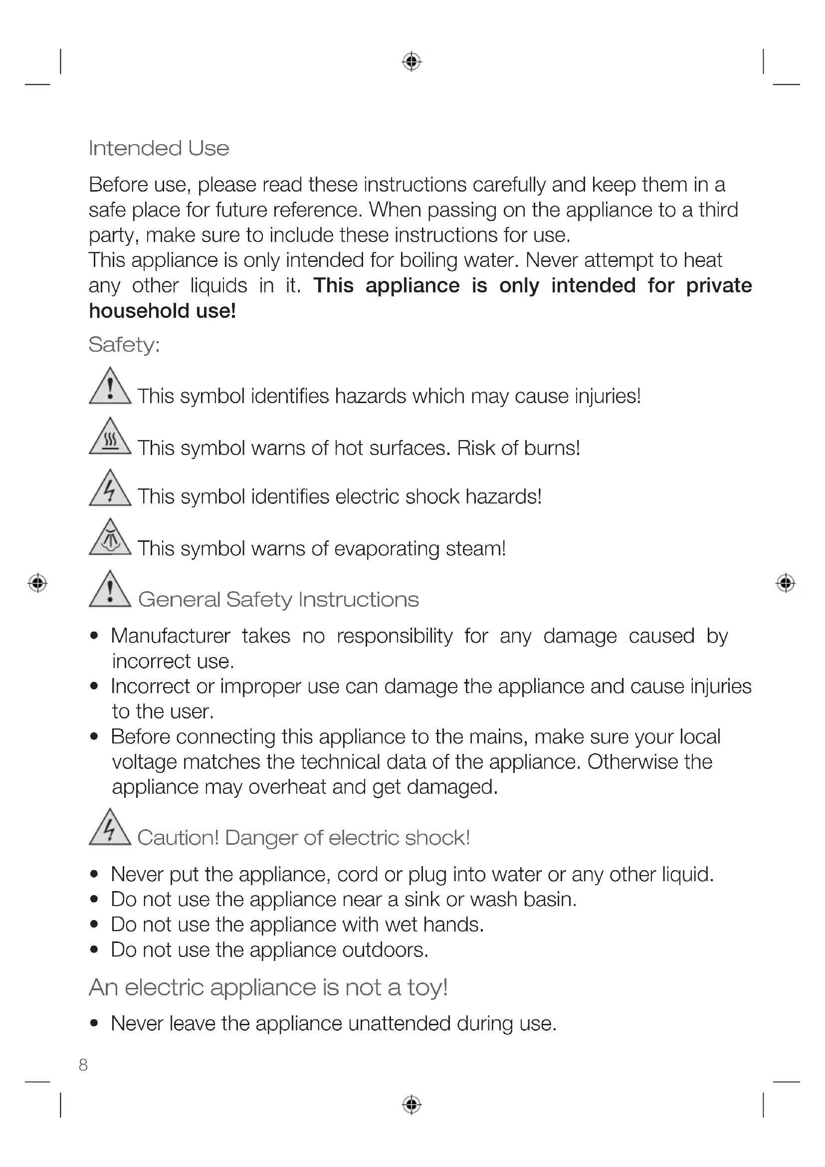 - Your kettle is only intended for boiling water. Never attempt to heat any other liquids in it.