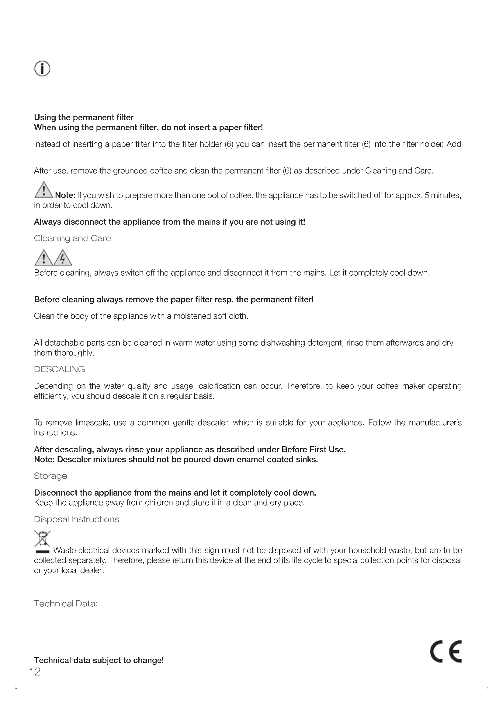 Before cleaning always remove the paper filter resp. the permanent filter!