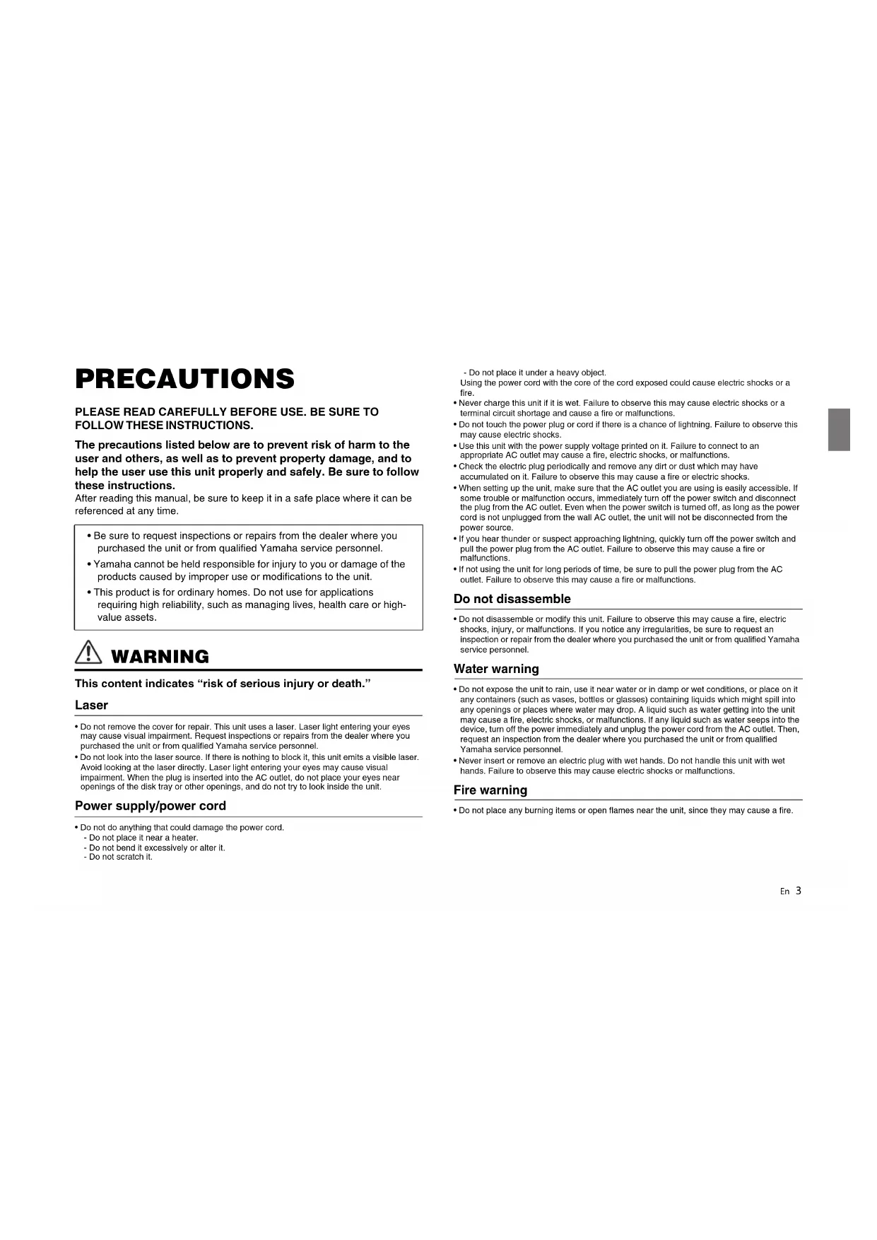 - Do not remove the cover for repair. This unit uses a laser. Laser light entering your eyes may cause visual impairment. Request inspections or repairs from the dealer where you purchased the unit or from qualified Yamaha service personnel.• Do not look into the laser source. If there is nothing to block it, this unit emits a visible laser. Avoid looking at the laser directly. Laser light entering your eyes may cause visual impairment. When the plug is inserted into the AC outlet, do not place your eyes near openings of the disk tray or other openings, and do not try to look inside the unit. Power supply/power cord