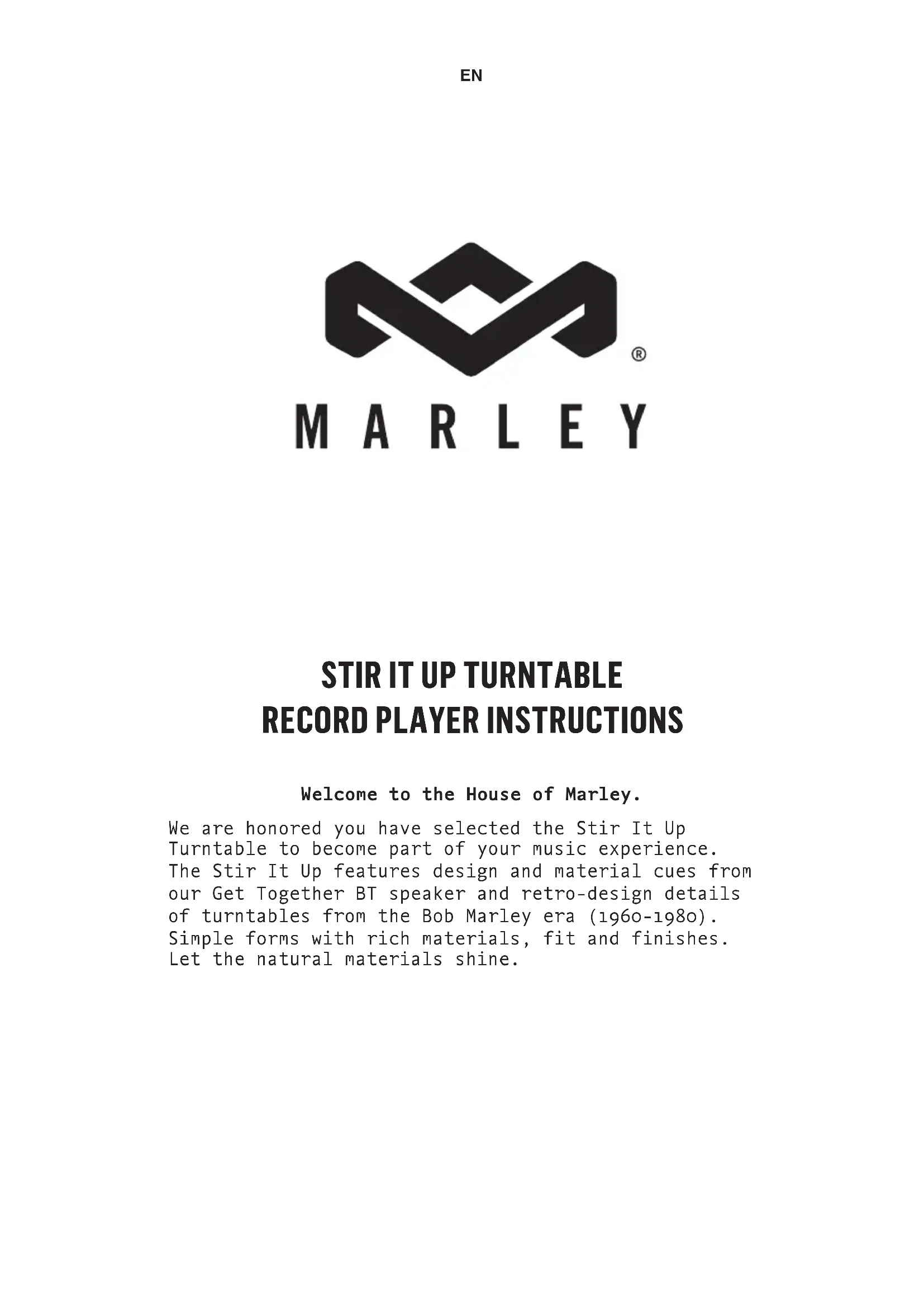 Welcome to the House of Marley. We are honored you have selected the Stir It Up Turntable to become part of your music experience. The Stir It Up features design and material cues from our Get Together BT speaker and retro-design details of turntables from the Bob Marley era (1960-1980). Simple forms with rich materials, fit and finishes. Let the natural materials shine. ENBEFORE USE