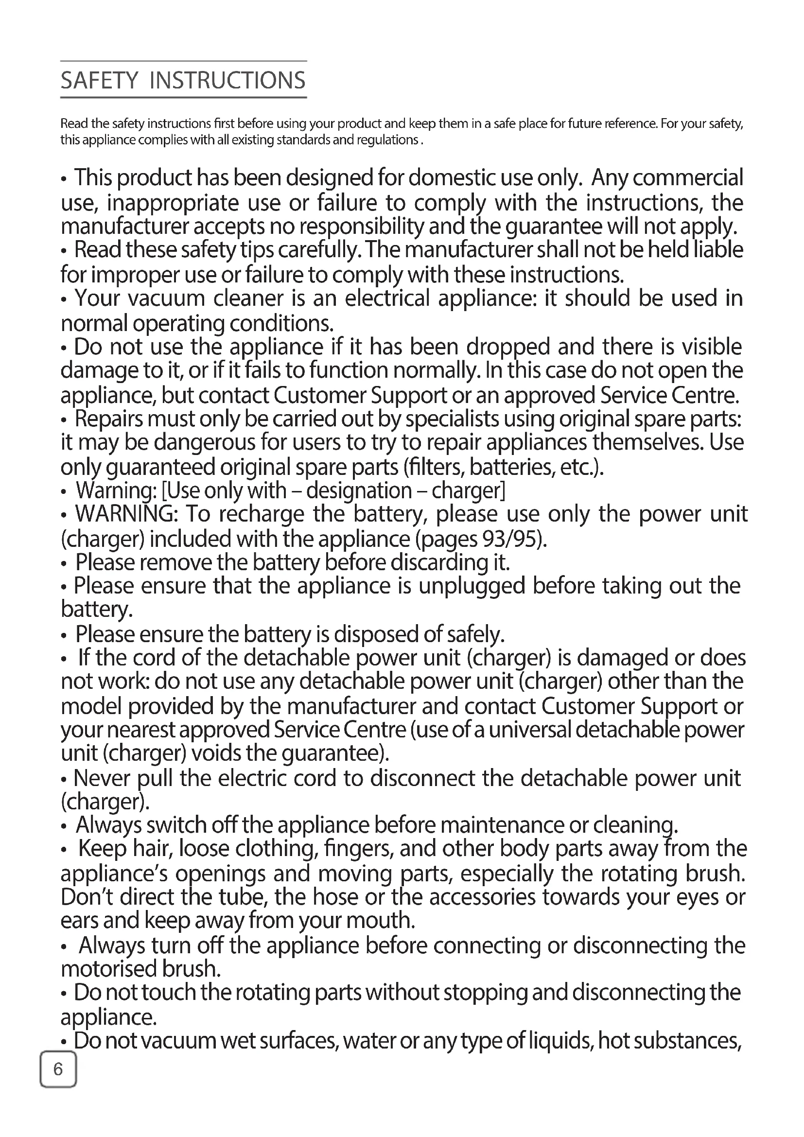 Your appliance stops during ope- ration and the light/s flash very quickly. Your appliance may be overhea- ting. Stop the appliance and leave cool for at least 1 hour. The appliance has stopped after the charge light ashed. The appliance has lost its charge. Recharge the vacuum cleaner. The power-brush is not working properly or makes a noise. The rotating brush or hose are obstructed. Stop the vacuum and clean the parts. The brush is worn. Contact an Approved Service Centre to change the brush. The belt is worn. Contact an Approved Service Centre to change the belt.9 The power-brush stops during use of the vacuum cleaner. The heat safety device has come on. Stop the vacuum cleaner. Check that nothing is obstructing the ro- tation of the brush; if there is an obstruction, remove it and clean the power-brush, then turn on the vacuum cleaner. Your vacuum cleaner suction is not working properly or is making a whistling noise. The tube or hose is partially blocked. Unblock them the tube/hose. The dust collector is full. Empty it and clean it. The dust collector is not properly tted. Re-position it correctly. The suction head is dirty. Remove the power-brush and clean it. The foam motor protection lter is full. Clean it. When charging the vacuum cleaner, the light(s) ash very quickly. The correct charger is not being used or the charger is faulty. Talk to an Approved Service Centre to change the charger. Please keep this user manual. EN10 SICHERHEITSHINWEISE Um Ihre Sicherheit zu gewährleisten, entspricht dieses Gerät den gültigen Normen und Richtlinien.