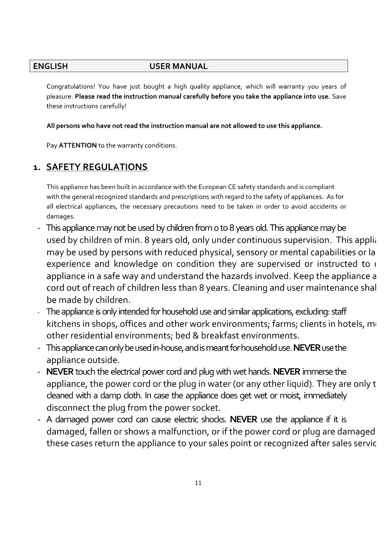 THE APPLIANCE HAS BEEN DESIGNED FOR DOMESTIC USE. THE WARRANTY CONDITIONS EXPIRE UPON PROFESSIONAL USE. DEFECTS AND/OF DAMAGES FOLLOWING TO THE NON OBSERVANCE OF THE USER MANUAL ARE NOT COVERED BY THE WARRANTY.