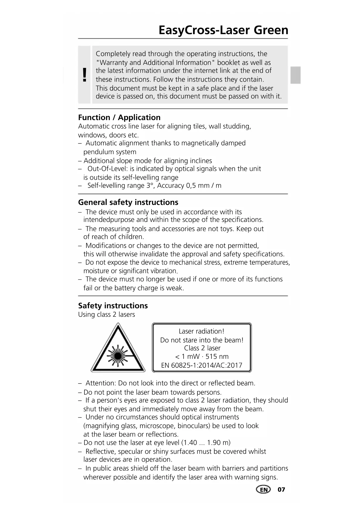 Function / Application Automatic cross line laser for aligning tiles, wall studding, windows, doors etc. – Automatic alignment thanks to magnetically damped pendulum system – Additional slope mode for aligning inclines – Out-Of-Level: is indicated by optical signals when the unit is outside its self-levelling range – Self-levelling range 3°, Accuracy 0,5 mm / m Safety instructions Using class 2 lasers – Attention: Do not look into the direct or reected beam. – Do not point the laser beam towards persons. – If a person‘s eyes are exposed to class 2 laser radiation, they should shut their eyes and immediately move away from the beam. – Under no circumstances should optical instruments (magnifying glass, microscope, binoculars) be used to look at the laser beam or reections. – Do not use the laser at eye level (1.40 ... 1.90 m) – Reective, specular or shiny surfaces must be covered whilst laser devices are in operation. – In public areas shield off the laser beam with barriers and partitions wherever possible and identify the laser area with warning signs. Laser radiation! Do not stare into the beam! Class 2 laser < 1 mW · 515 nm EN 60825-1:2014/AC:2017 General safety instructions – The device must only be used in accordance with its intendedpurpose and within the scope of the specications. – The measuring tools and accessories are not toys. Keep out of reach of children. – Modications or changes to the device are not permitted, this will otherwise invalidate the approval and safety specications. – Do not expose the device to mechanical stress, extreme temperatures, moisture or signicant vibration