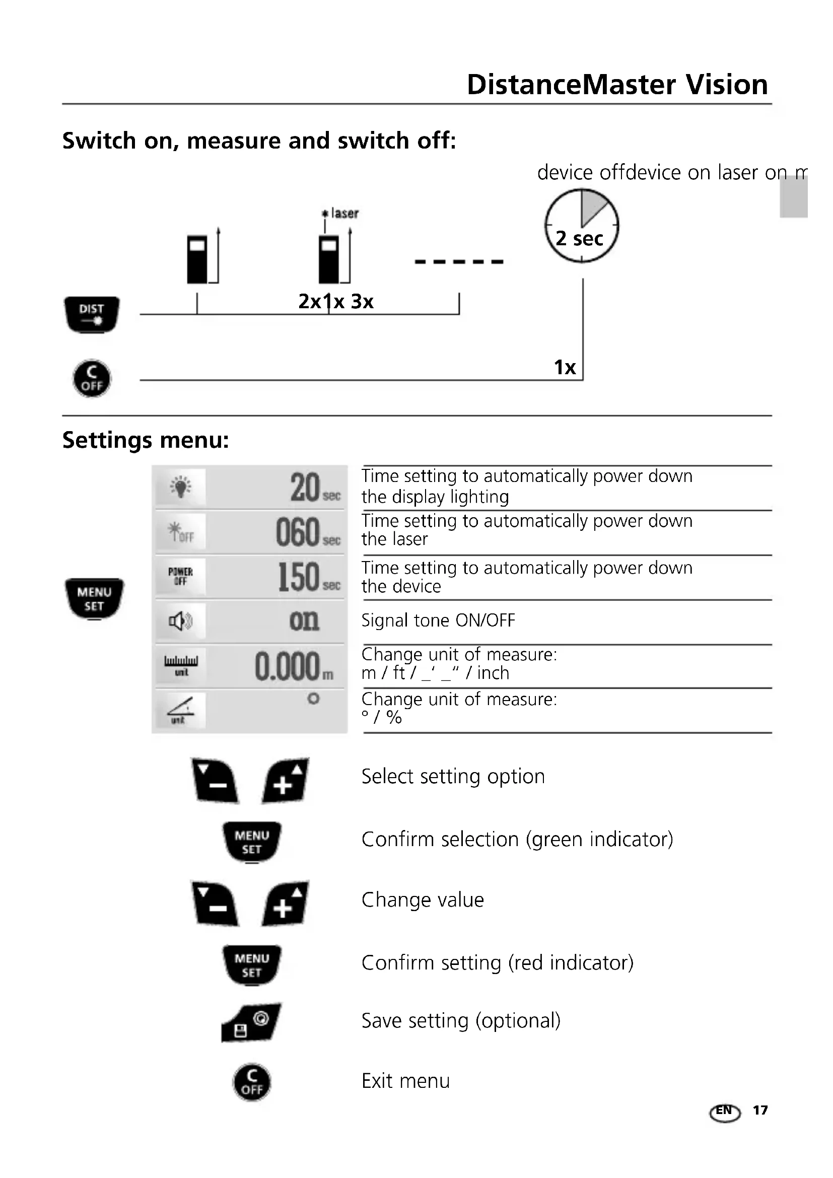 2x1x 3x Save setting (optional) Settings menu: Switch on, measure and switch off: Time setting to automatically power down the display lighting Time setting to automatically power down the laser Select setting option Change value Confirm selection (green indicator) Confirm setting (red indicator) Exit menu Time setting to automatically power down the device Signal tone ON/OFF Change unit of measure: m / ft / _‘ _“ / inch Change unit of measure:
