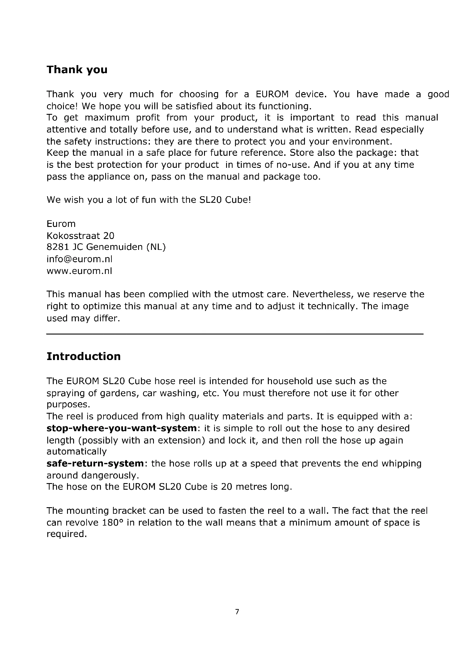 Introduction The EUROM SL20 Cube hose reel is intended for household use such as the spraying of gardens, car washing, etc. You must therefore not use it for other purposes. The reel is produced from high quality materials and parts. It is equipped with a: stop-where-you-want-system: it is simple to roll out the hose to any desired length (possibly with an extension) and lock it, and then roll the hose up again automatically safe-return-system: the hose rolls up at a speed that prevents the end whipping around dangerously. The hose on the EUROM SL20 Cube is 20 metres long. The mounting bracket can be used to fasten the reel to a wall. The fact that the reel can revolve 180° in relation to the wall means that a minimum amount of space is required.8 Technical details Length of hose 20 m Hose material PVC Housing material