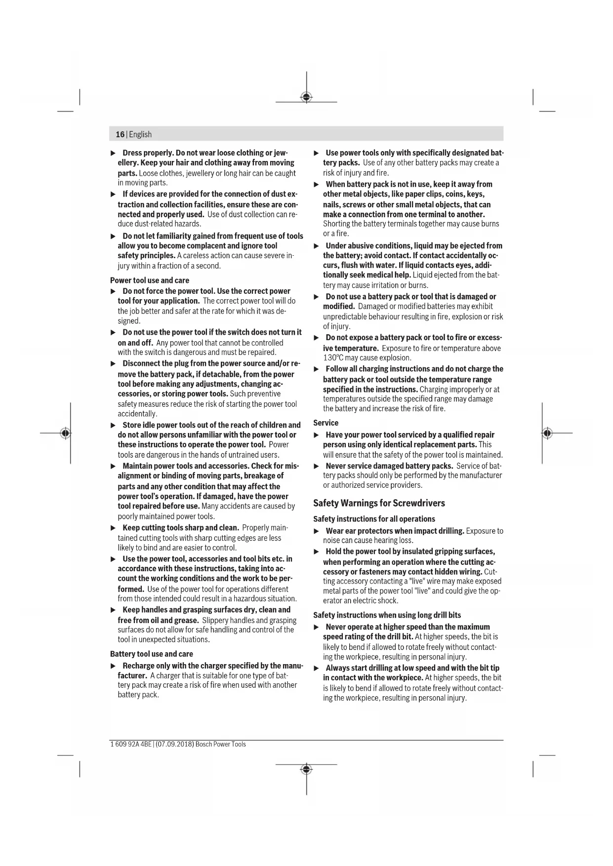 Accessories shown or described are not included with the product as standard. You can find the complete selection of accessories in our accessories range. Technical Data Cordless drill/driver AdvancedDrill 18 Cordless combi drill AdvancedImpact 18 Article number 3 603 JB5 0.. 3 603 JB5 1.. Rated voltage V= 18 18 No-load speed English | 17 Bosch Power Tools 1 609 92A 4BE | (07.09.2018)18 | English 1 609 92A 4BE | (07.09.2018) Bosch Power Tools Cordless drill/driver AdvancedDrill 18 Cordless combi drill AdvancedImpact 18 – Screws (first screw phase) rpm 0–430 0–450 – Drilling/impact drilling (second screw phase) rpm 0–1350 0–1500 Impact rate rpm – 0–22,500 Max. torque, hard/soft screwdriving applica- tion according to ISO 5393 Nm 36/24