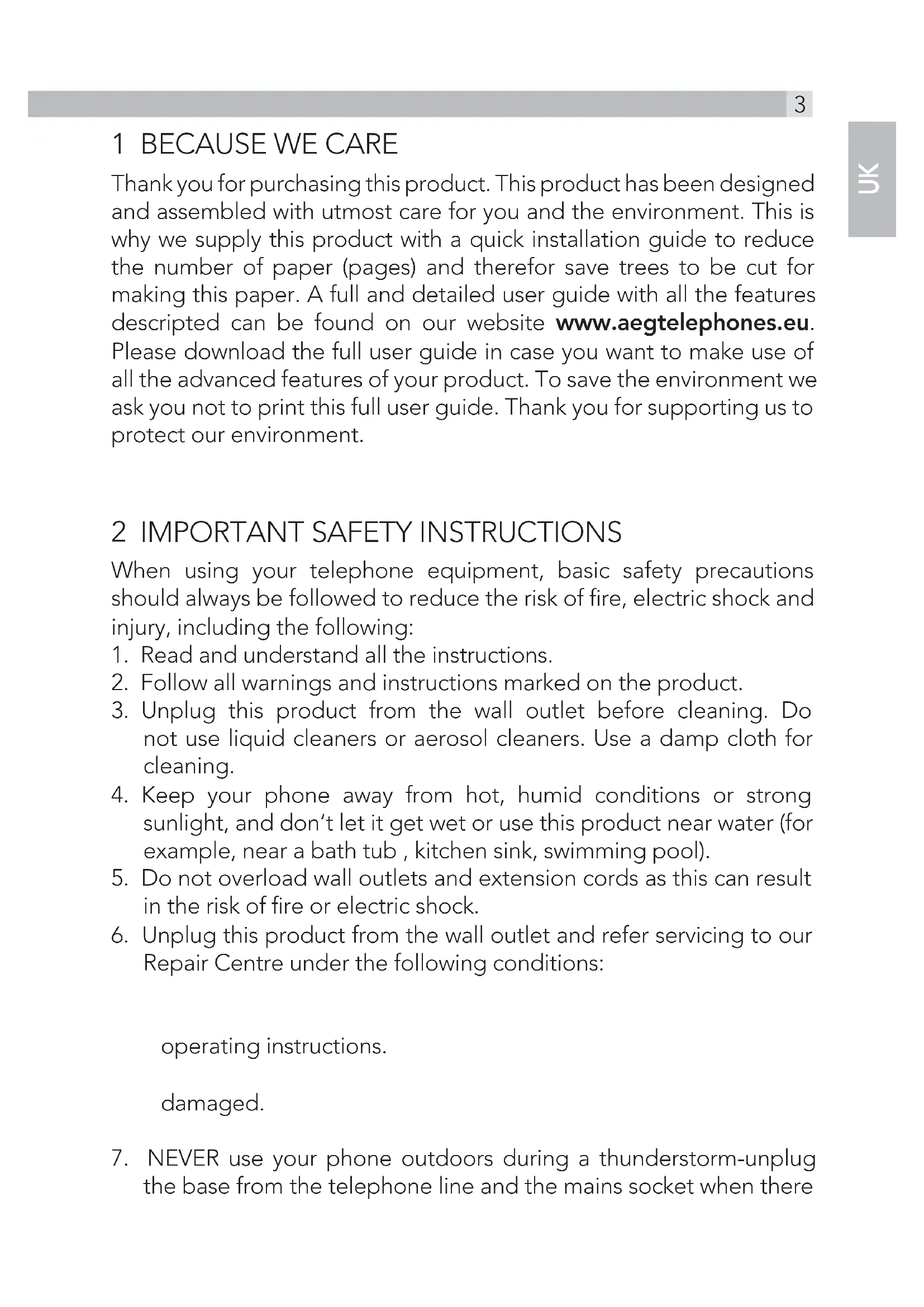 Thank you for purchasing this product. This product has been designed and assembled with utmost care for you and the environment. This is why we supply this product with a quick installation guide to reduce the number of paper (pages) and therefor save trees to be cut for making this paper. A full and detailed user guide with all the features descripted can be found on our website www.aegtelephones.eu. Please download the full user guide in case you want to make use of all the advanced features of your product. To save the environment we ask you not to print this full user guide. Thank you for supporting us to protect our environment.