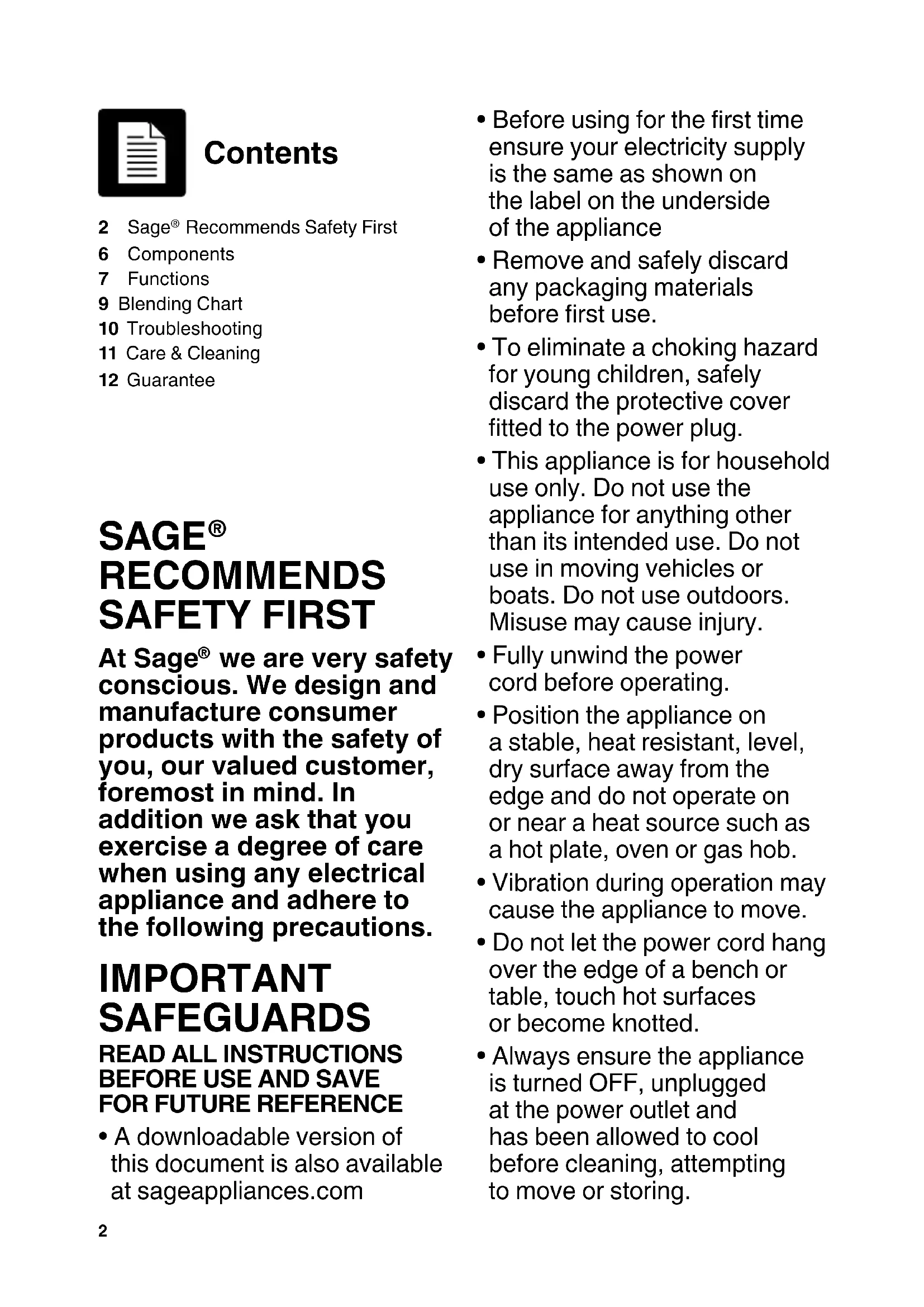 - Always ensure the appliance is turned OFF, unplugged at the power outlet and has been allowed to cool before cleaning, attempting to move or storing. 2 Sage Recommends Safety First6 Components7 Functions9 Blending Chart10 Troubleshooting11 Care & Cleaning12 Guarantee Contents3