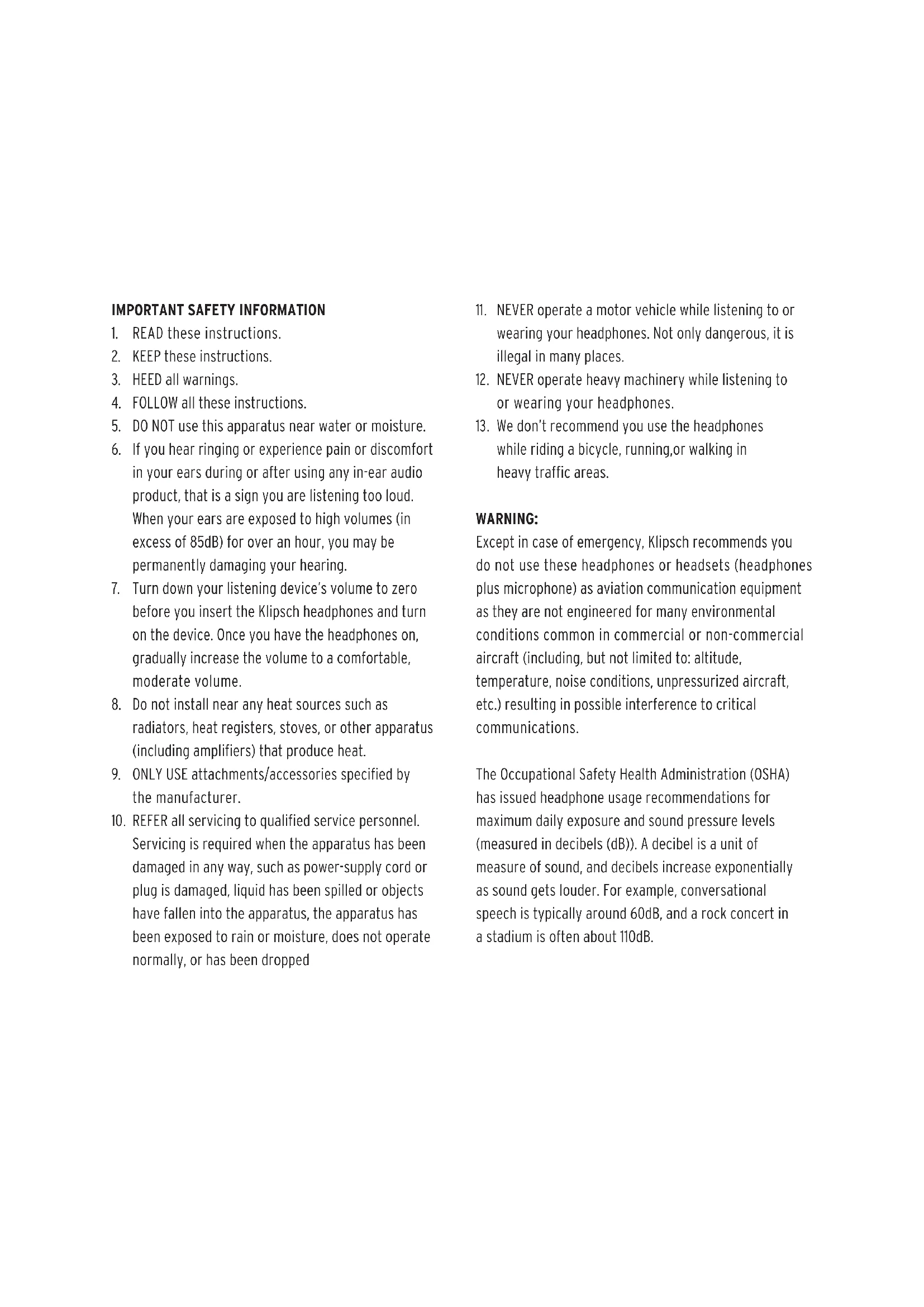 Except in case of emergency, Klipsch recommends you do not use these headphones or headsets (headphones plus microphone) as aviation communication equipment as they are not engineered for many environmental conditions common in commercial or non-commercial aircraft (including, but not limited to: altitude, temperature, noise conditions, unpressurized aircraft, etc.) resulting in possible interference to critical communications. The Occupational Safety Health Administration (OSHA) has issued headphone usage recommendations for maximum daily exposure and sound pressure levels (measured in decibels (dB)). A decibel is a unit of measure of sound, and decibels increase exponentially as sound gets louder. For example, conversational speech is typically around 60dB, and a rock concert in a stadium is often about 110dB.OSHA GUIDELINES FOR NOISE EXPOSURE LIMITS